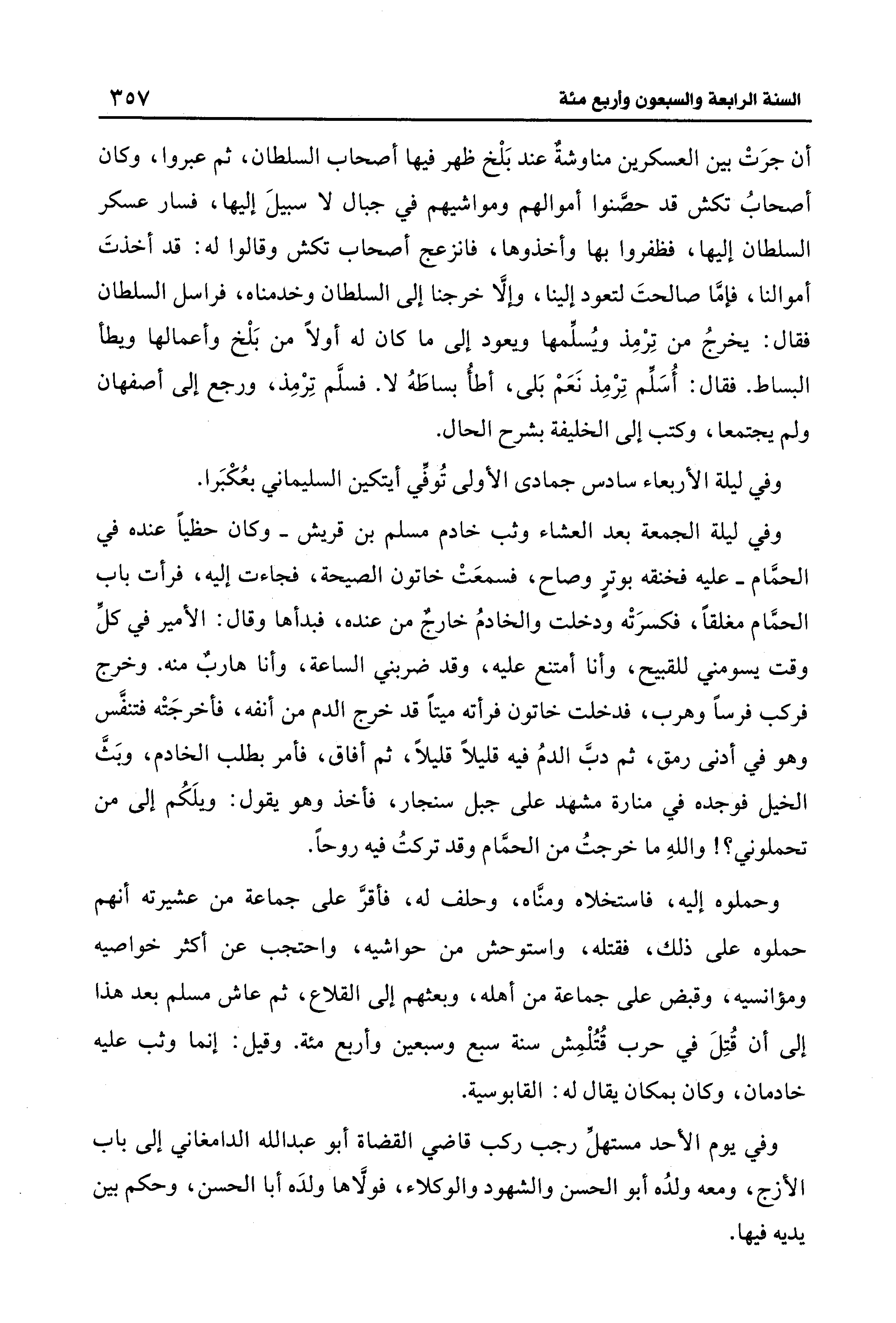 وفي ليلة الجمعة بعد العشاء وثب خادم مسلم بن قريش - وكان حظيًّا عنده في الحمَّام - عليه فخنقه بوترٍ وصاح، فسمعَتْ خاتون الصيحة، فجاءت إليه، فرأت باب الحمَّام مغلقًا، فكسرَتْه ودخلت والخادمُ خارجٌ من عنده، فبدأها وقال: الأمير في كلِّ وقت يسومني للقبيح، وأنا أمتنع عليه، وقد ضربني الساعة، وأنا هاربٌ منه. وخرج فركب فرسًا وهرب، فدخلت خاتون فرأته ميتًا قد خرج الدم من أنفه، فأخرجَتْه فتنفَّس وهو في أدنى رمق، ثم دبَّ الدمُ فيه قليلًا قليلًا، ثم أفاق، فأمر بطلب الخادم، وبَثَّ الخيل فوجده في منارة مشهد على جبل سنجار، فأخذ وهو يقول: ويلَكُم إلى من تحملوني؟ ! واللهِ ما خرجتُ من الحمَّام وقد تركتُ فيه روحًا.