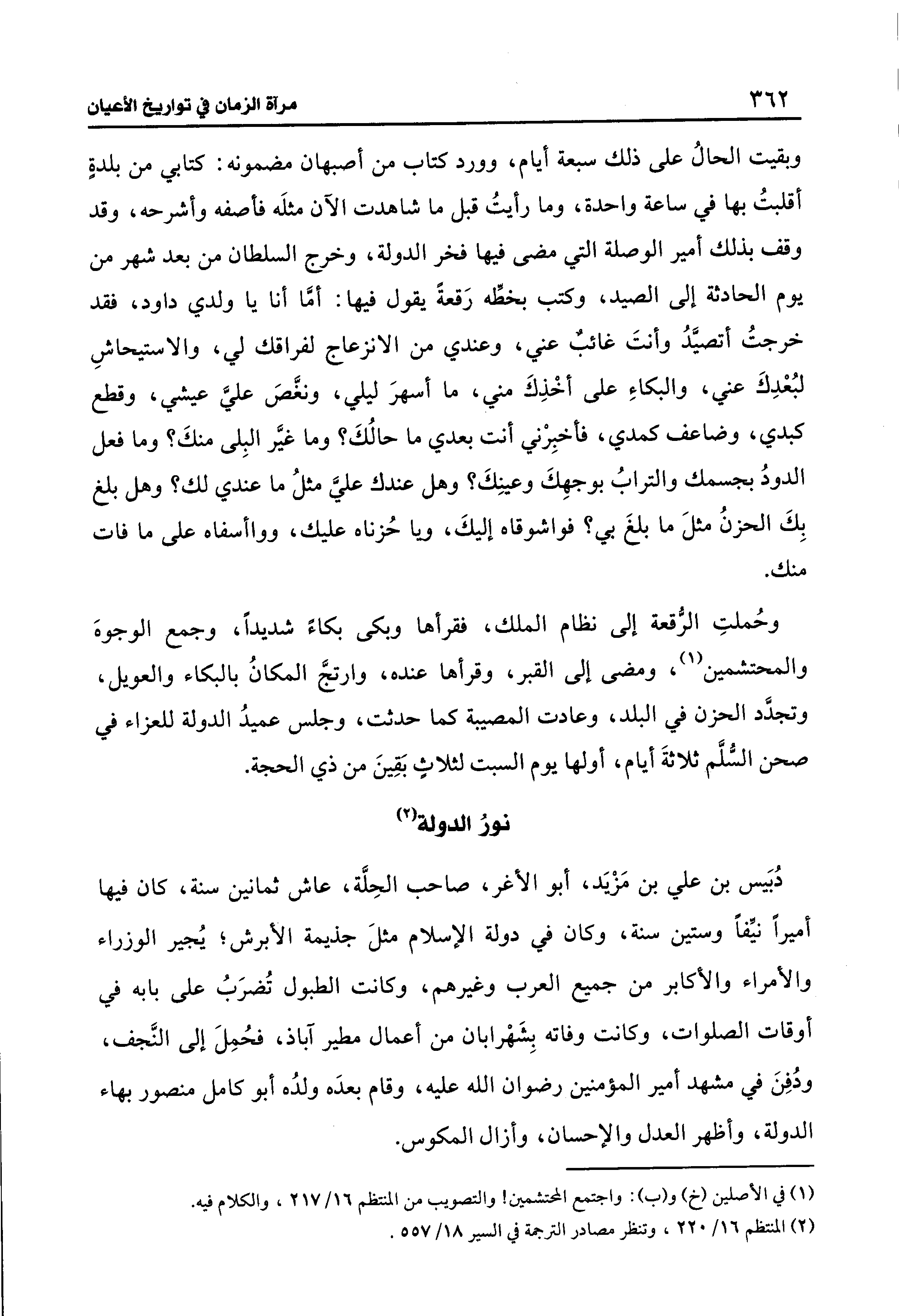 وبقيت الحالُ على ذلك سبعة أيام، وورد كتاب من أصبهان مضمونه: كتابي من بلدةٍ أقلبتُ بها في ساعة واحدة، وما رأيتُ قبل ما شاهدت الآن مثلَه فأصفه وأشرحه، وقد وقف بذلك أمير الوصلة التي مضى فيها فخر الدولة، وخرج السلطان من بعد شهر من يوم الحادثة إلى الصيد، وكتب بخطِّه رَقعةً يقول فيها: أمَّا أنا يا ولدي داود، فقد خرجتُ أتصيدُ وأنتَ غائبٌ عني، وعندي من الانزعاج لفراقك لي، والاستيحاشِ لبُعْدِكَ عني، والبكاءِ على أخْذِكَ مني، ما أسهرَ ليلي، ونغَّصَ عليَّ عيشي، وقطع كبدي، وضاعف كمدي، فأخبِرْني أنت بعدي ما حالُكَ؟ وما غيَّر البِلى منكَ؟ وما فعل الدودُ بجسمك والترابُ بوجهِكَ وعينِكَ؟ وهل عندك علي مثلُ ما عندي لك؟ وهل بلغ بِكَ الحزنُ مثلَ ما بلغَ بي؟ فواشوقاه إليكَ، ويا حُزناه عليك، ووا أسفاه على ما فات منك.