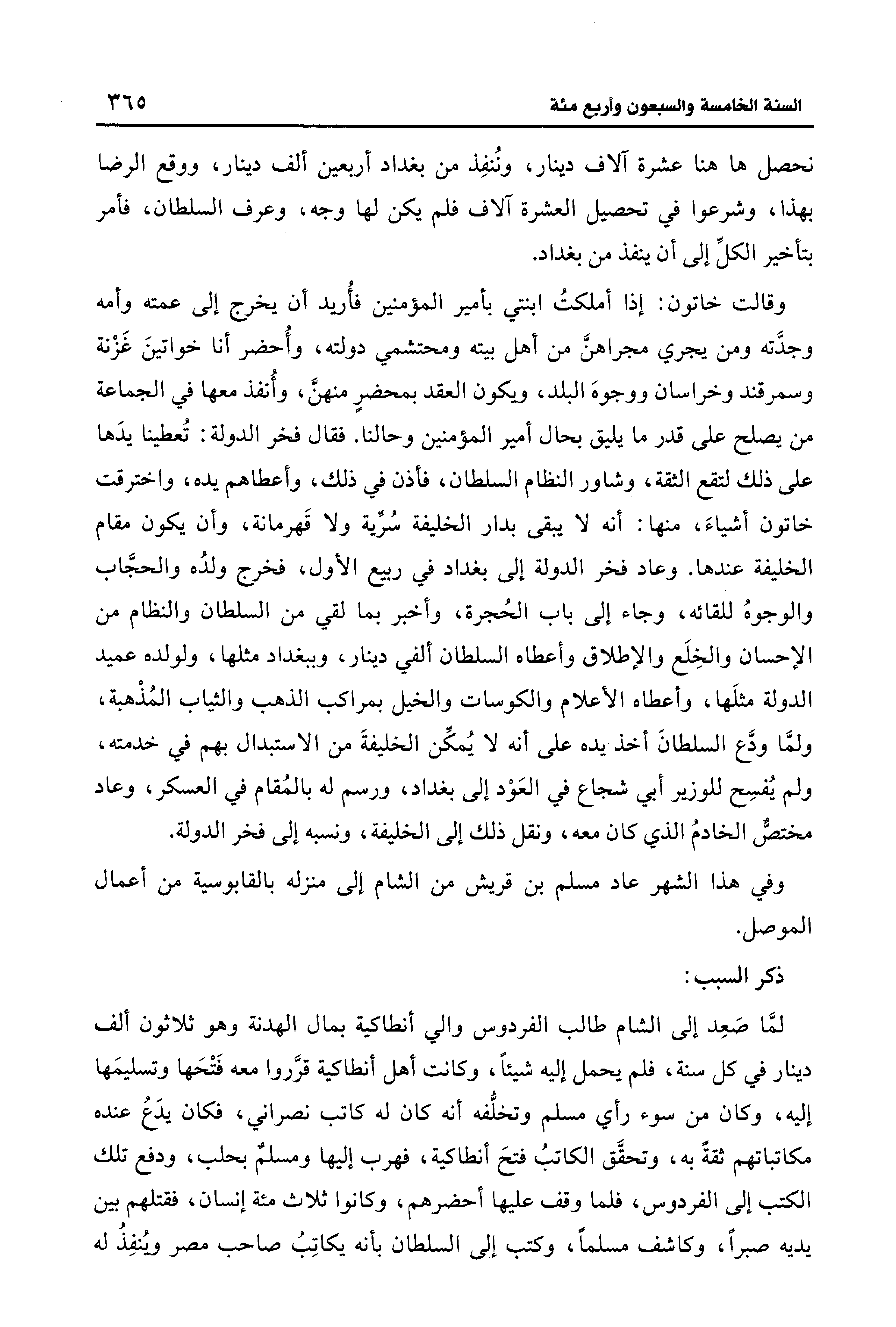 نحصل ها هنا عشرة آلاف دينار، ونُنفِذ من بغداد أربعين ألف دينار، ووقع الرضا بهذا، وشرعوا في تحصيل العشرة آلاف فلم يكن لها وجه، وعرف السلطان، فأمر بتأخير الكلِّ إلى أن ينفذ من بغداد.