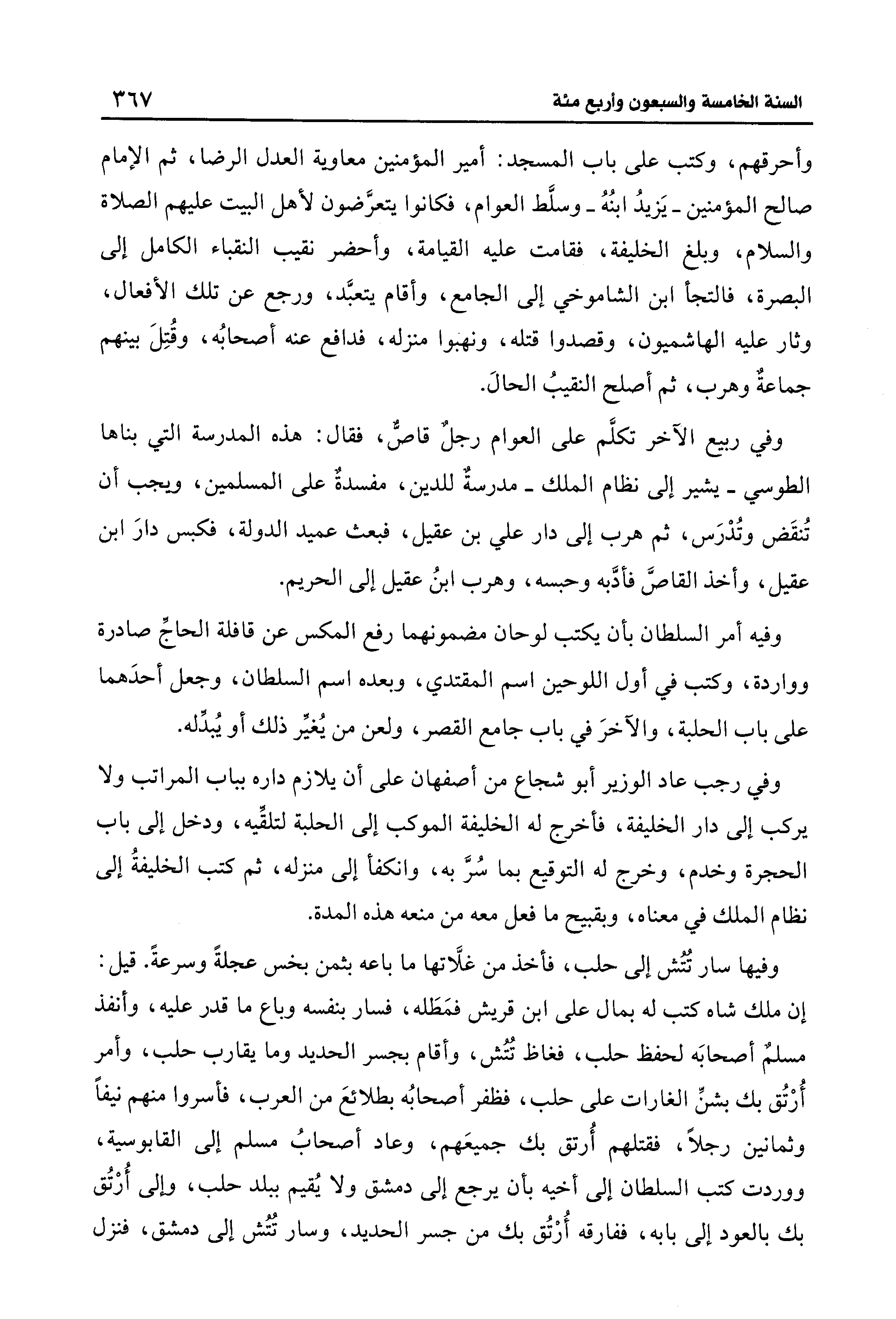 وفيه أمر السلطان بأن يكتب لوحان مضمونهما رفع المكس عن قافلة الحاجِّ صادرة وواردة، وكتب في أول اللوحين اسم المقتدي، وبعده اسم السلطان، وجعل أحدَهما على باب الحلبة، والآخرَ في باب جامع القصر، ولعن من يُغيِّر ذلك أو يُبدِّله.