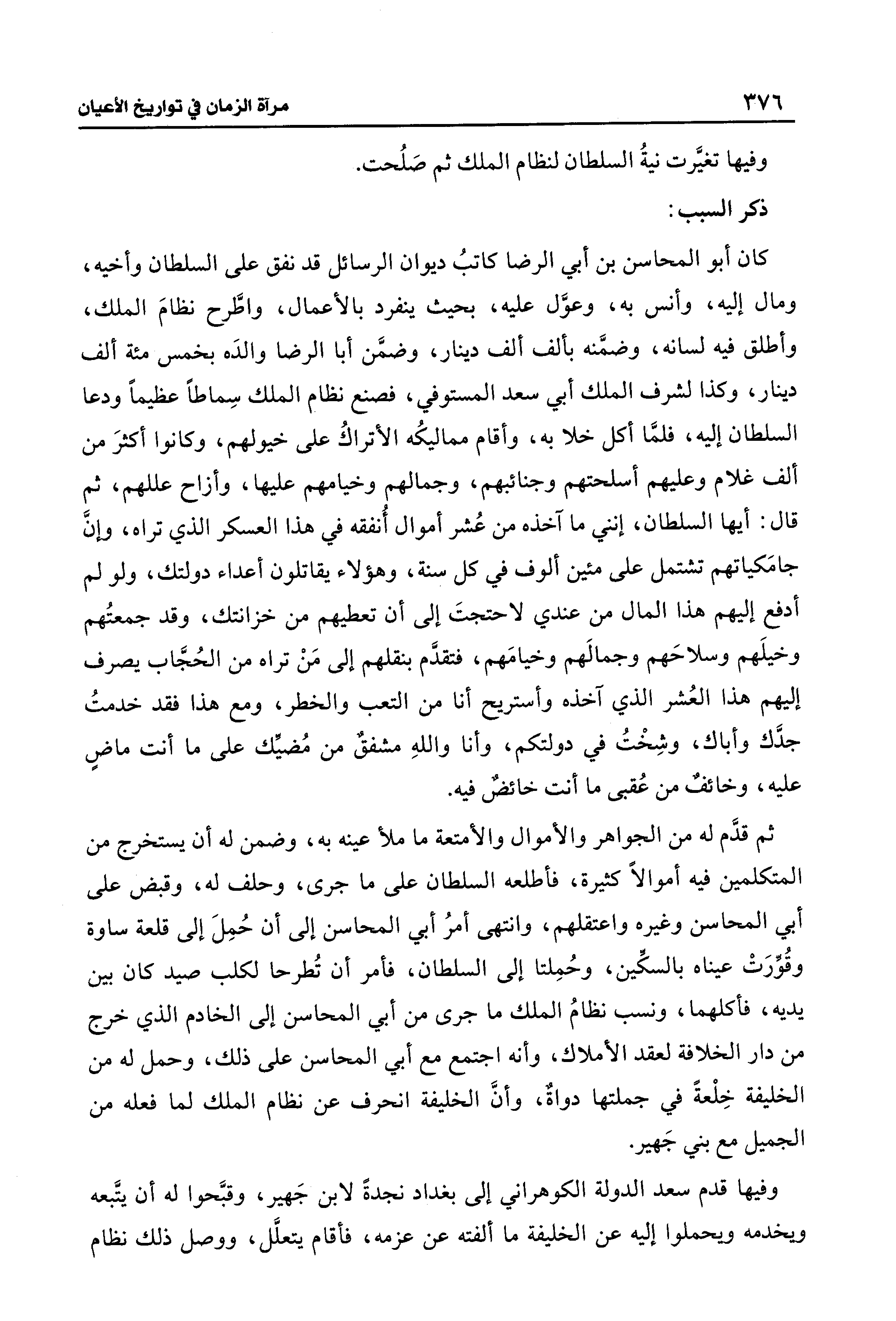 كان أبو المحاسن بن أبي الرضا كاتبُ ديوان الرسائل قد نفق على السلطان وأخيه، ومال إليه، وأنس به، وعوَّل عليه، بحيث ينفرد بالأعمال، واطَّرح نظامَ الملك، وأطلق فيه لسانه، وضمَّنه بألف ألف دينار، وضمَّن أبا الرضا والدَه بخمس مئة ألف دينار، وكذا لشرف الملك أبي سعد المستوفي، فصنع نظام الملك سِماطًا عظيمًا ودعا السلطان إليه، فلمَّا أكل خلا به، وأقام مماليكُه الأتراكُ على خيولهم، وكانوا أكثرَ من ألف غلام وعليهم أسلحتهم وجنائبهم، وجمالهم وخيامهم عليها، وأزاح عللهم، ثم قال: أيها السلطان، إنني ما آخذه من عُشر أموال أُنفقه في هذا العسكر الَّذي تراه، وإنَّ جامَكياتهم تشتمل على مئين ألوف في كل سنة، وهؤلاء يقاتلون أعداء دولتك، ولو لم أدفع إليهم هذا المال من عندي لاحتجتَ إلى أن تعطيهم من خزانتك، وقد جمعتُهم وخيلَهم وسلاحَهم وجمالَهم وخيامَهم، فتقدَّم بنقلهم إلى مَنْ تراه من الحُجَّاب يصرف إليهم هذا العُشر الَّذي آخذه وأستريح أنا من التعب والخطر، ومع هذا فقد خدمتُ جدَّك وأباك، وشِخْتُ في دولتكم، وأنا واللهِ مشفقٌ من مُضيِّك على ما أنت ماضٍ عليه، وخائفٌ من عُقبى ما أنت خائضٌ فيه.