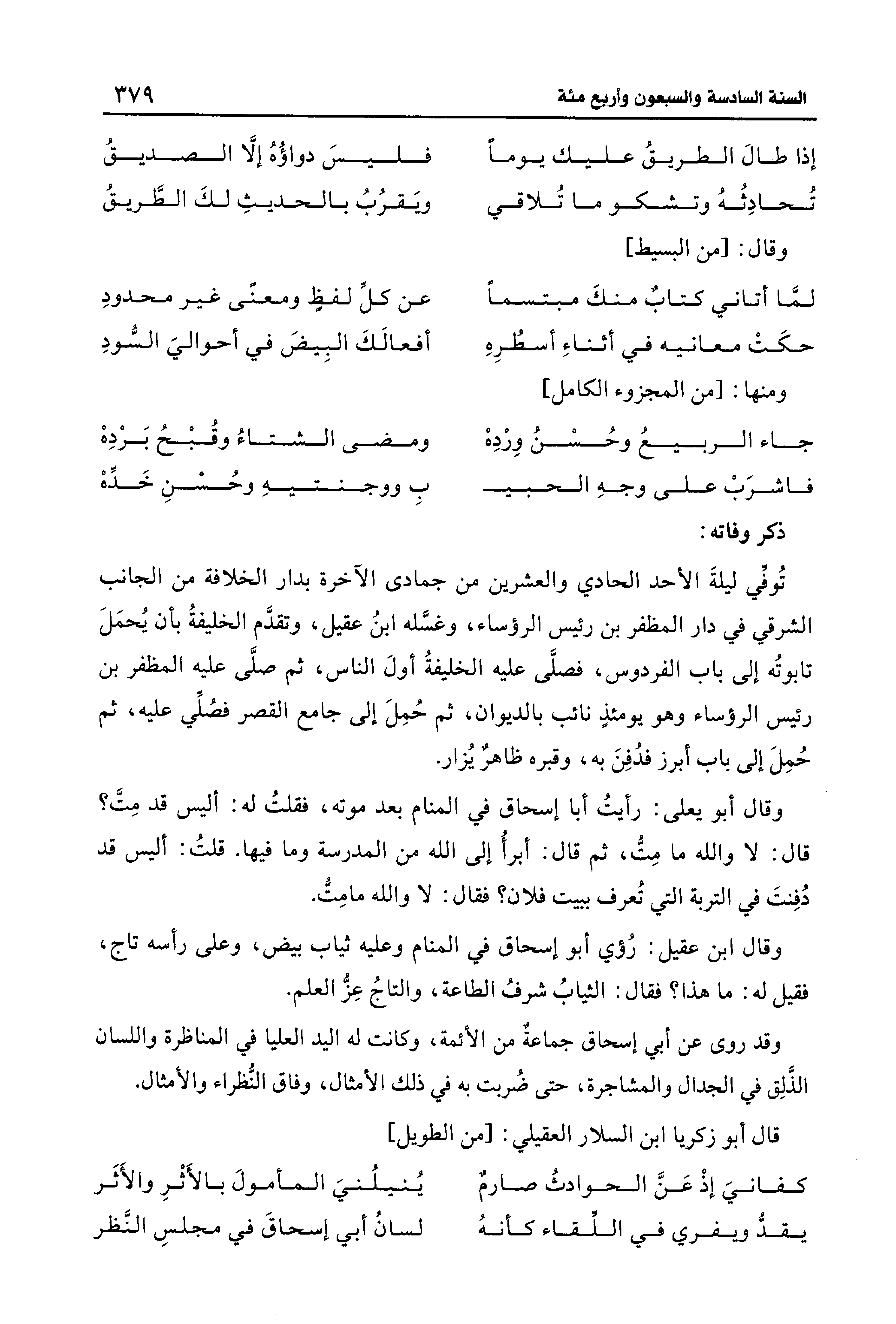 وقال ابن عقيل: رُؤي أبو إسحاق في المنام وعليه ثياب بيض، وعلى رأسه تاج، فقيل له: ما هذا؟ فقال: الثيابُ شرفُ الطاعة، والتاجُ عِزُّ العلم.