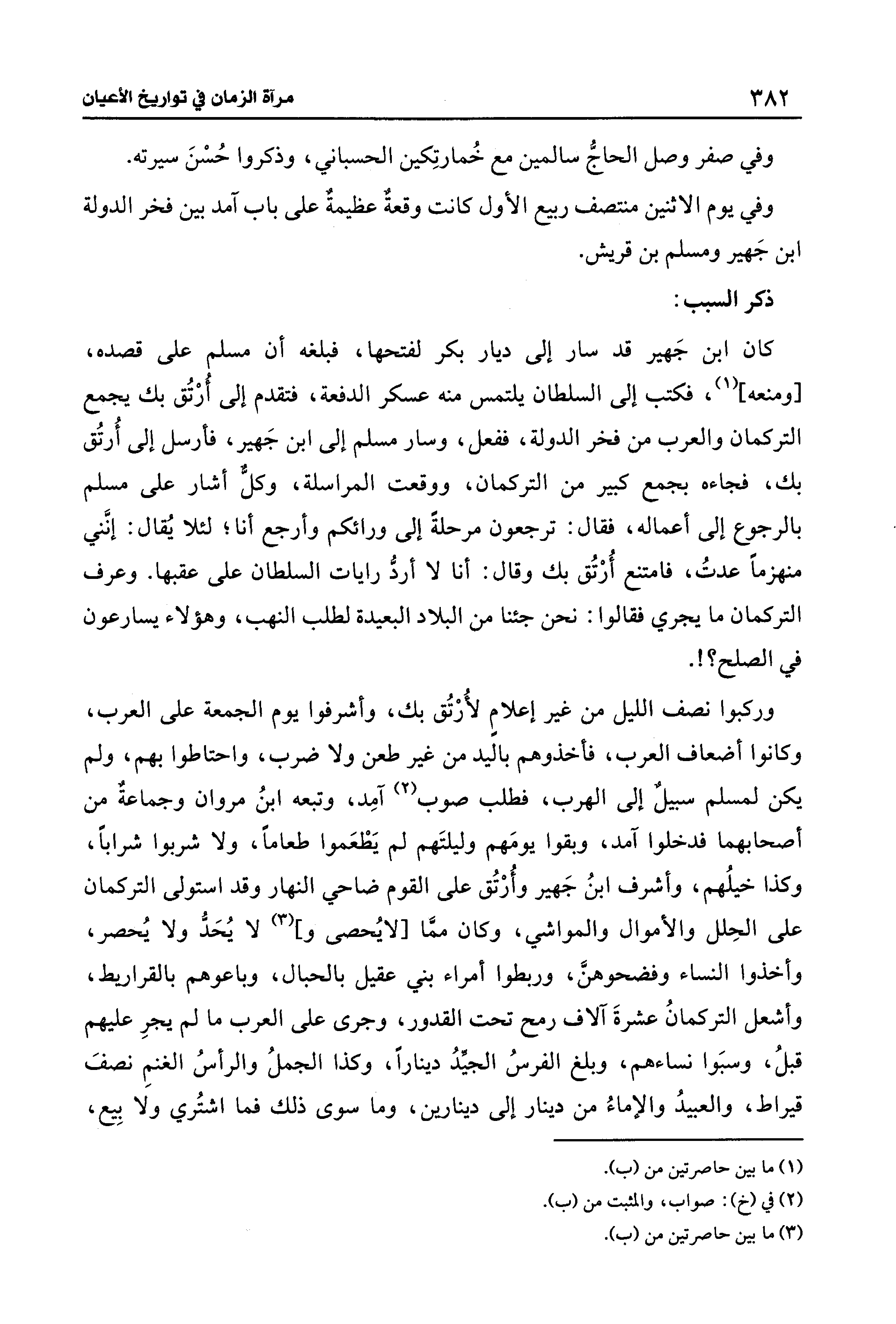 كان ابن جَهير قد سار إلى ديار بكر لفتحها، فبلغه أن مسلم على قصده، [ومنعه] (¬1)، فكتب إلى السلطان يلتمس منه عسكر الدفعة، فتقدم إلى ارْتُق بك يجمع التركمان والعرب من فخر الدولة، ففعل، وسار مسلم إلى ابن جَهير، فأرسل إلى أُرتُق بك، فجاءه بجمع كبير من التركمان، ووقعت المراسلة، وكلٌّ أشار على مسلم بالرجوع إلى أعماله، فقال: ترجعون مرحلةً إلى ورائكم وأرجع أنا؛ لئلا يُقال: إنَّني منهزمًا عدتُ، فامتنع أُرْتُق بك وقال: أنا لا أردُّ رايات السلطان على عقبها. وعرف التركمان ما يجري فقالوا: نحن جئنا من البلاد البعيدة لطلب النهب، وهؤلاء يسارعون في الصلح؟ ! .