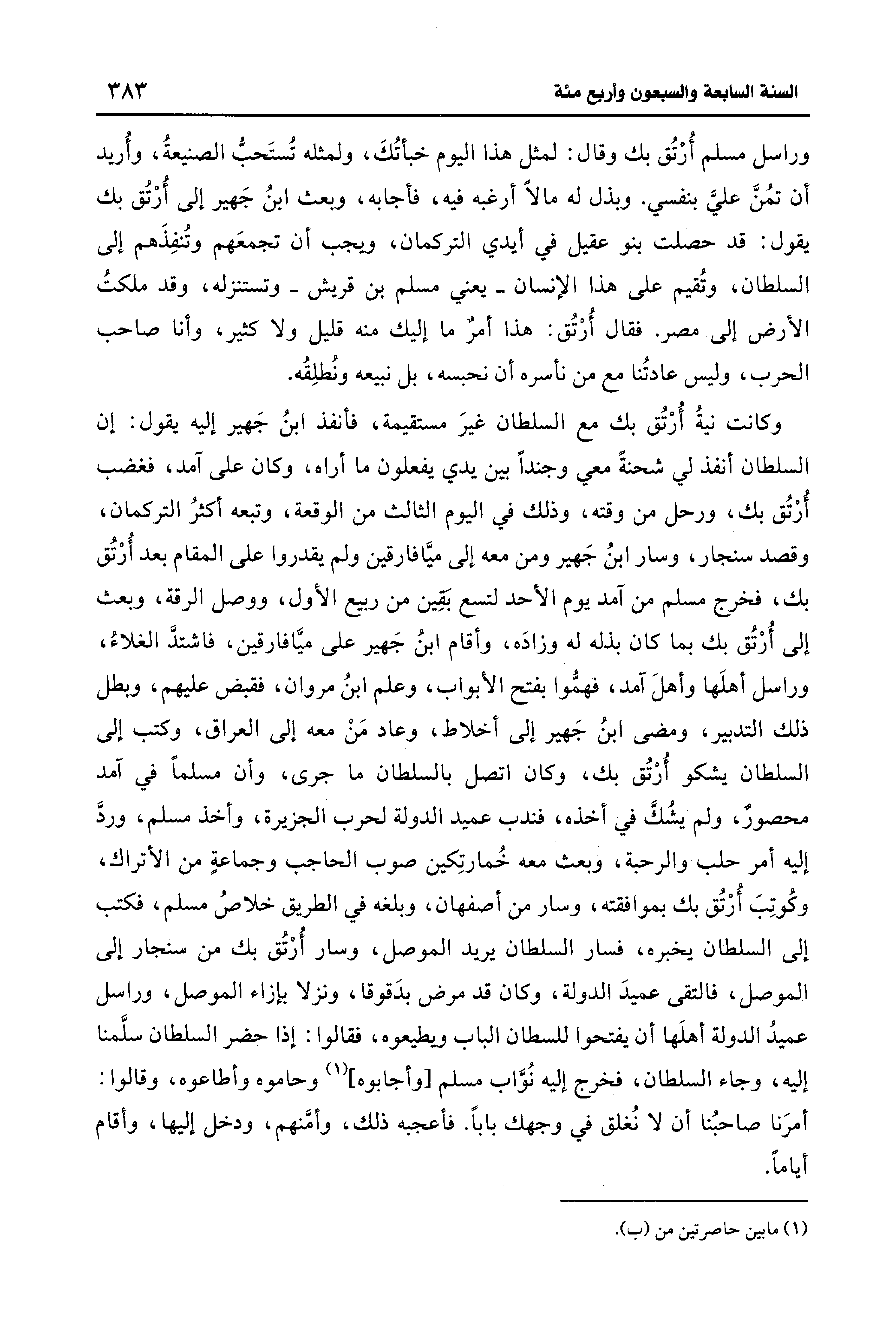 وراسل مسلم أُرْتُق بك وقال: لمثل هذا اليوم خبأتُكَ، ولمثله تُستَحبُّ الصنيعةُ، وأُريد أن تمُنَّ عليَّ بنفسي. وبذل له مالًا أرغبه فيه، فأجابه، وبعث ابنُ جَهير إلى أُرْتُق بك يقول: قد حصلت بنو عقيل في أيدي التركمان، ويجب أن تجمعَهم وتُنفِذَهم إلى السلطان، وتُقيم على هذا الإنسان -يعني مسلم بن قريش- وتستنزله، وقد ملكتُ الأرض إلى مصر. فقال أُرْتُق: هذا أمر ما إليك منه قليل ولا كثير، وأنا صاحب الحرب، وليس عادتُنا مع من نأسره أن نحبسه، بل نبيعه ونُطلِقُه.