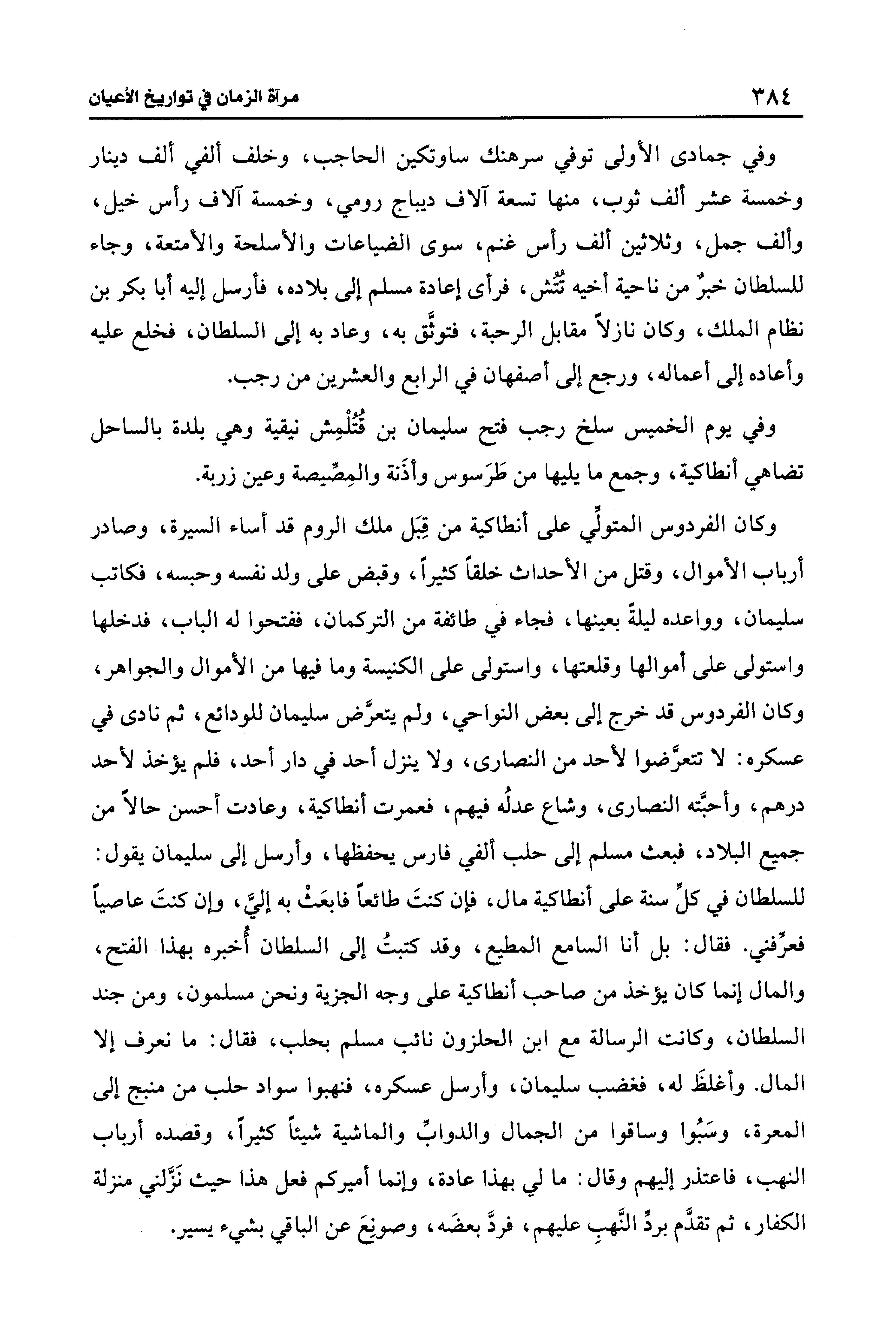 وكان الفردوس المتولِّي على أنطاكية من قِبَل ملك الروم قد أساء السيرة، وصادر أرباب الأموال، وقتل من الأحداث خلقًا كثيرًا، وقبض على ولد نفسه وحبسه، فكاتب سليمان، وواعده ليلةً بعينها، فجاء في طائفة من التركمان، ففتحوا له الباب، فدخلها واستولى على أموالها وقلعتها، واستولى على الكنيسة وما فيها من الأموال والجواهر، وكان الفردوس قد خرج إلى بعض النواحي، ولم يتعرَّض سليمان للودائع، ثم نادى في عسكره: لا تتعرَّضوا لأحد من النصارى، ولا ينزل أحد في دار أحد، فلم يؤخذ لأحد درهم، وأحبَّته النصارى، وشاع عدلُه فيهم، فعمرت أنطاكية، وعادت أحسن حالًا من جميع البلاد، فبعث مسلم إلى حلب ألفي فارس يحفظها، وأرسل إلى سليمان يقول: للسلطان في كلِّ سنة على أنطاكية مال، فإن كنتَ طائعًا فابعَثْ به إليَّ، وإن كنتَ عاصيًا فعرِّفني. فقال: بل أنا السامع المطيع، وقد كتبتُ إلى السلطان أُخبره بهذا الفتح، والمال إنما كان يؤخذ من صاحب أنطاكية على وجه الجزية ونحن مسلمون، ومن جند السلطان، وكانت الرسالة مع ابن الحلزون نائب مسلم بحلب، فقال: ما نعرف إلَّا المال. وأغلظَ له، فغضب سليمان، وأرسل عسكره، فنهبوا سواد حلب من منبج إلى المعرة، وسَبُوا وساقوا من الجمال والدوابِّ والماشية شيئًا كثيرًا، وقصده أرباب النهب، فاعتذر إليهم وقال: ما لي بهذا عادة، وإنما أميركم فعل هذا حيث نَزَّلني منزلة الكفار، ثم تقدَّم بردِّ النَّهبِ عليهم، فردَّ بعضَه، وصونِعَ عن الباقي بشيء يسير.