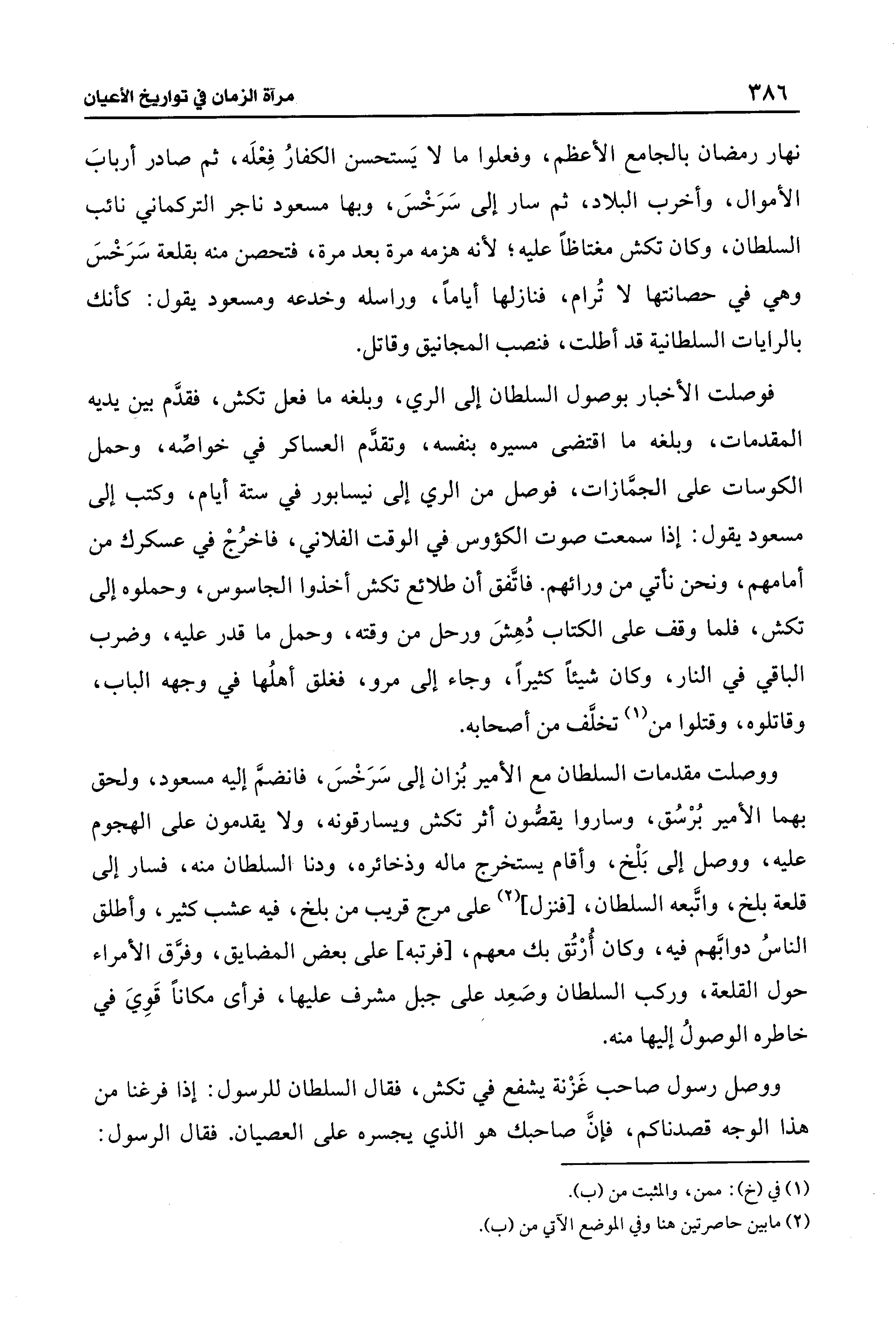 ووصلت مقدمات السلطان مع الأمير بُزان إلى سَرَخْسَ، فانضمَّ إليه مسعود، ولحق بهما الأمير بُرْسُق، وساروا يقصُّون أثر تكش ويسارقونه، ولا يقدمون على الهجوم عليه، ووصل إلى بَلْخ، وأقام يستخرج ماله وذخائره، ودنا السلطان منه، فسار إلى قلعة بلخ، واتَّبعه السلطان، [فنزل] (¬2) على مرج قريب من بلخ، فيه عشب كثير، وأطلق النَّاسُ دوابَّهم فيه، وكان أُرْتُق بك معهم، [فرتبه] على بعض المضايق، وفرَّق الأمراء حول القلعة، وركب السلطان وصَعِد على جبل مشرف عليها، فرأى مكانًا قَويَ في خاطره الوصولُ إليها منه.