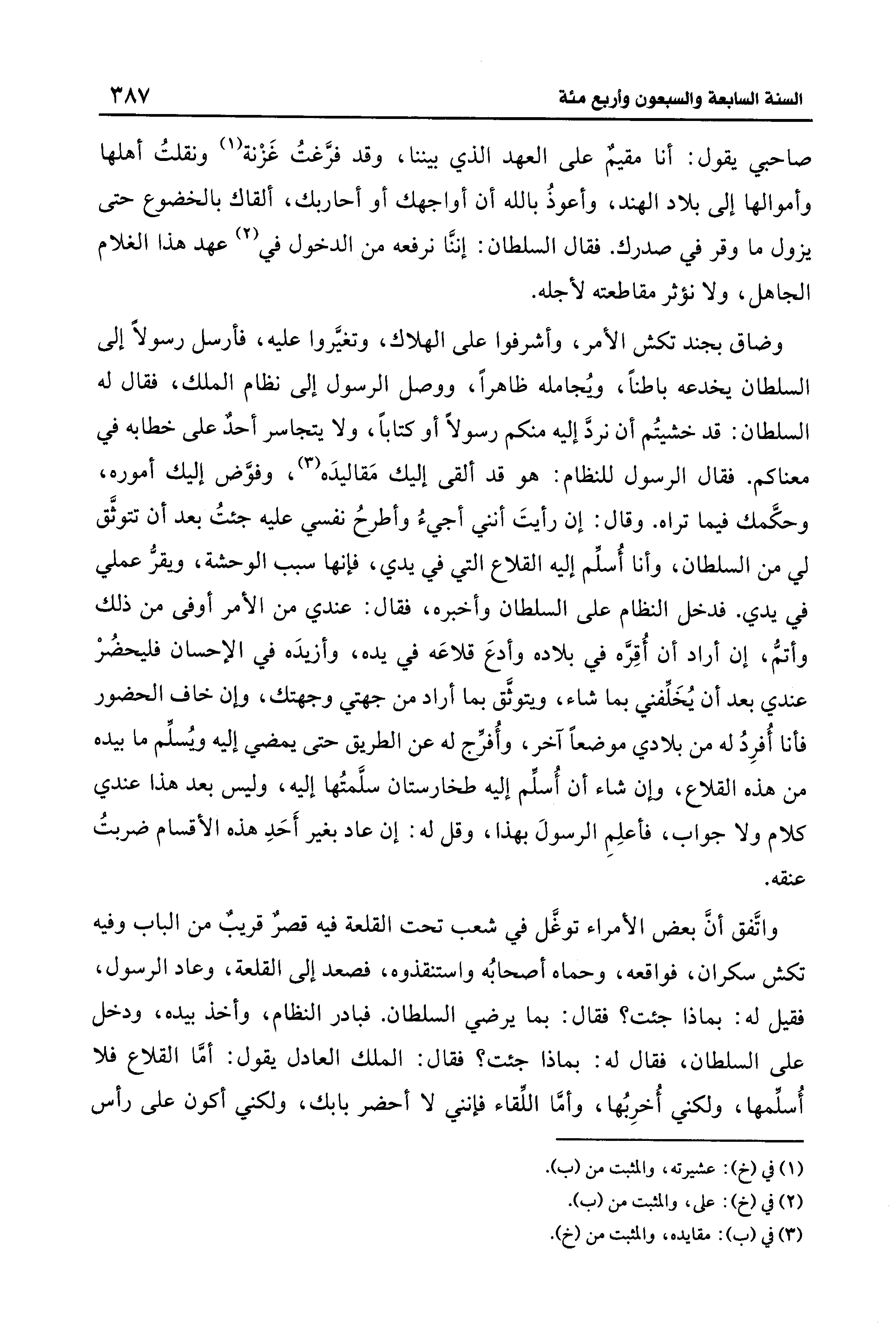 صاحبي يقول: أنا مقيمٌ على العهد الذي بيننا، وقد فرَّغتُ غَزْنة (¬1) ونقلتُ أهلها وأموالها إلى بلاد الهند، وأعوذُ بالله أن أواجهك أو أحاربك، ألقاك بالخضوع حتَّى يزول ما وقر في صدرك. فقال السلطان: إننَّا نرفعه من الدخول في (¬2) عهد هذا الغلام الجاهل، ولا نؤثر مقاطعته لأجله.