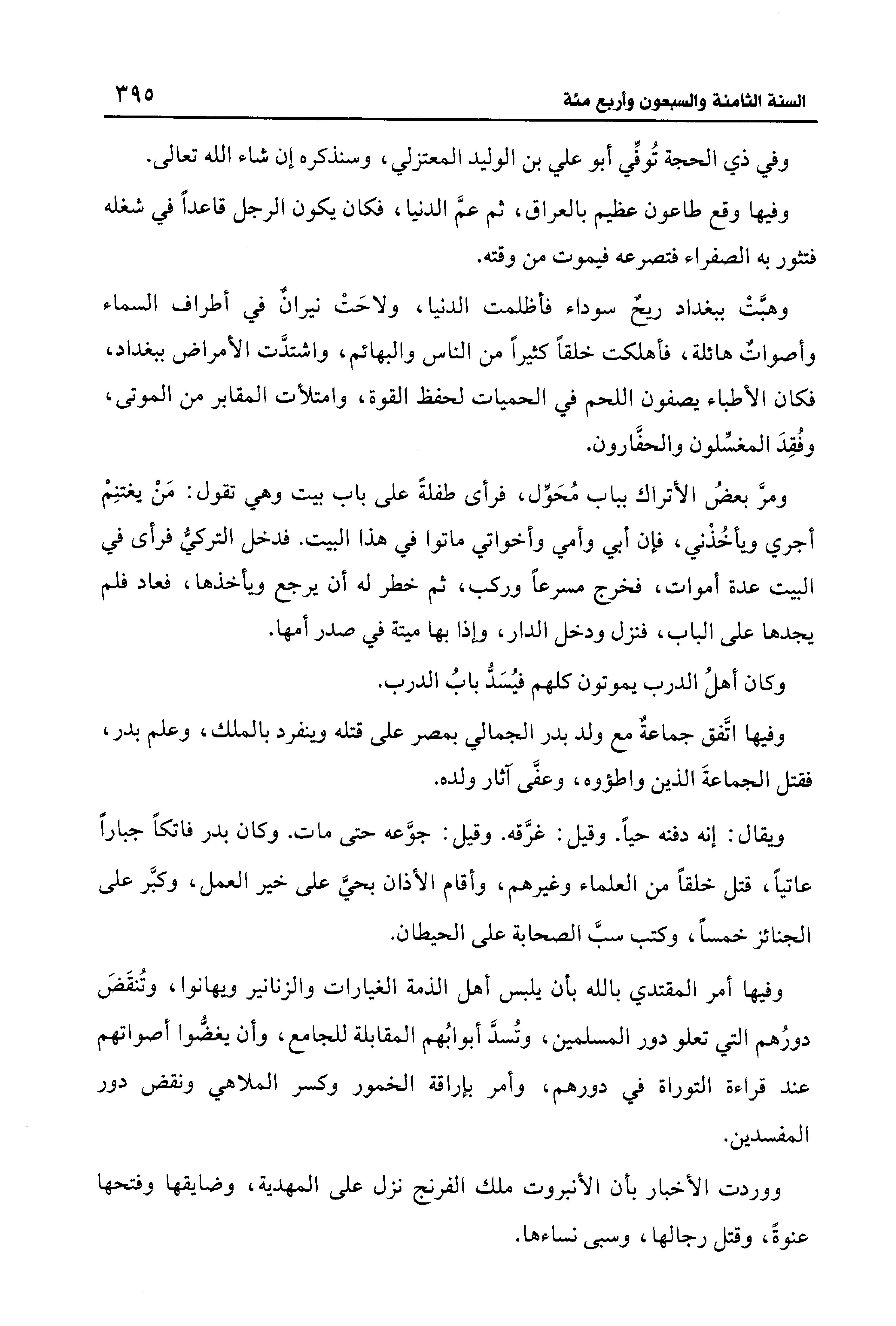وهبَّتْ ببغداد ريحٌ سوداء فأظلمت الدُّنيا، ولاحَتْ نيرانٌ في أطراف السماء وأصواتٌ هائلة، فأهلكت خلقًا كثيرًا من النَّاس والبهائم، واشتدَّت الأمراض ببغداد، فكان الأطباء يصفون اللحم في الحميات لحفظ القوة، وامتلأت المقابر من الموتى، وفُقِدَ المغسِّلون والحفَّارون.