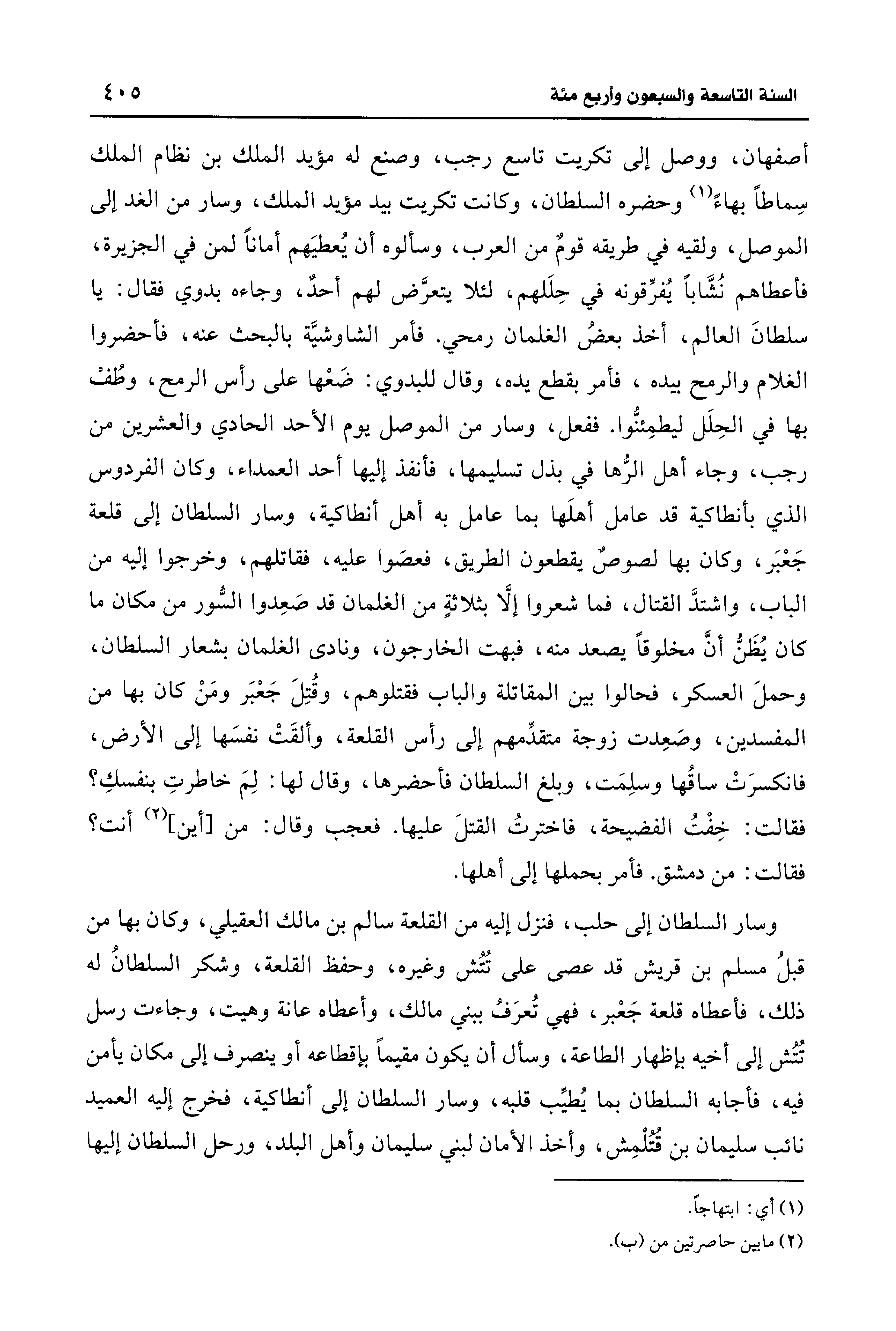 أصفهان، ووصل إلى تكريت تاسع رجب، وصنع له مؤيد الملك بن نظام الملك سِماطًا بهاءً (¬1) وحضره السلطان، وكانت تكريت بيد مؤيد الملك، وسار من الغد إلى الموصل، ولقيه في طريقه قومٌ من العرب، وسألوه أن يُعطيَهم أمانًا لمن في الجزيرة، فأعطاهم نُشَّابًا يُفرِّقونه في حِلَلهم، لئلا يتعرَّض لهم أحدٌ، وجاءه بدوي فقال: يا سلطانَ العالم، أخذ بعضُ الغلمان رمحي. فأمر الشاوشيَّة بالبحث عنه، فأحضروا الغلام والرمح بيده، فأمر بقطع يده، وقال للبدوي: ضَعْها على رأس الرمح، وطُفْ بها في الحِلَل ليطمِئنُّوا. ففعل، وسار من الموصل يوم الأحد الحادي والعشرين من رجب، وجاء أهل الرُّها في بذل تسليمها، فأنفذ إليها أحد العمداء، وكان الفردوس الذي بأنطاكية قد عامل أهلَها بما عامل به أهل أنطاكية، وسار السلطان إلى قلعة جَعْبَر، وكان بها لصوص يقطعون الطَّريق، فعصَوا عليه، فقاتلهم، وخرجوا إليه من الباب، واشتدَّ القتال، فما شعروا إلَّا بثلاثةٍ من الغلمان قد صَعِدوا السُّور من مكان ما كان يُظَنُّ أنَّ مخلوقًا يصعد منه، فبهت الخارجون، ونادى الغلمان بشعار السلطان، وحملَ العسكر، فحالوا بين المقاتلة والباب فقتلوهم، وقُتِلَ جَعْبَر ومَنْ كان بها من المفسدين، وصَعِدت زوجة متقدمهم إلى رأس القلعة، وألقَتْ نفسَها إلى الأرض، فانكسرَتْ ساقُها وسلِمَت، وبلغ السلطان فأحضرها، وقال لها: لِمَ خاطرتِ بنفسكِ؟ فقالت: خِفْتُ الفضيحة، فاخترتُ القتلَ عليها. فعجب وقال: من [أين] (¬2) أنت؟ فقالت: من دمشق. فأمر بحملها إلى أهلها.