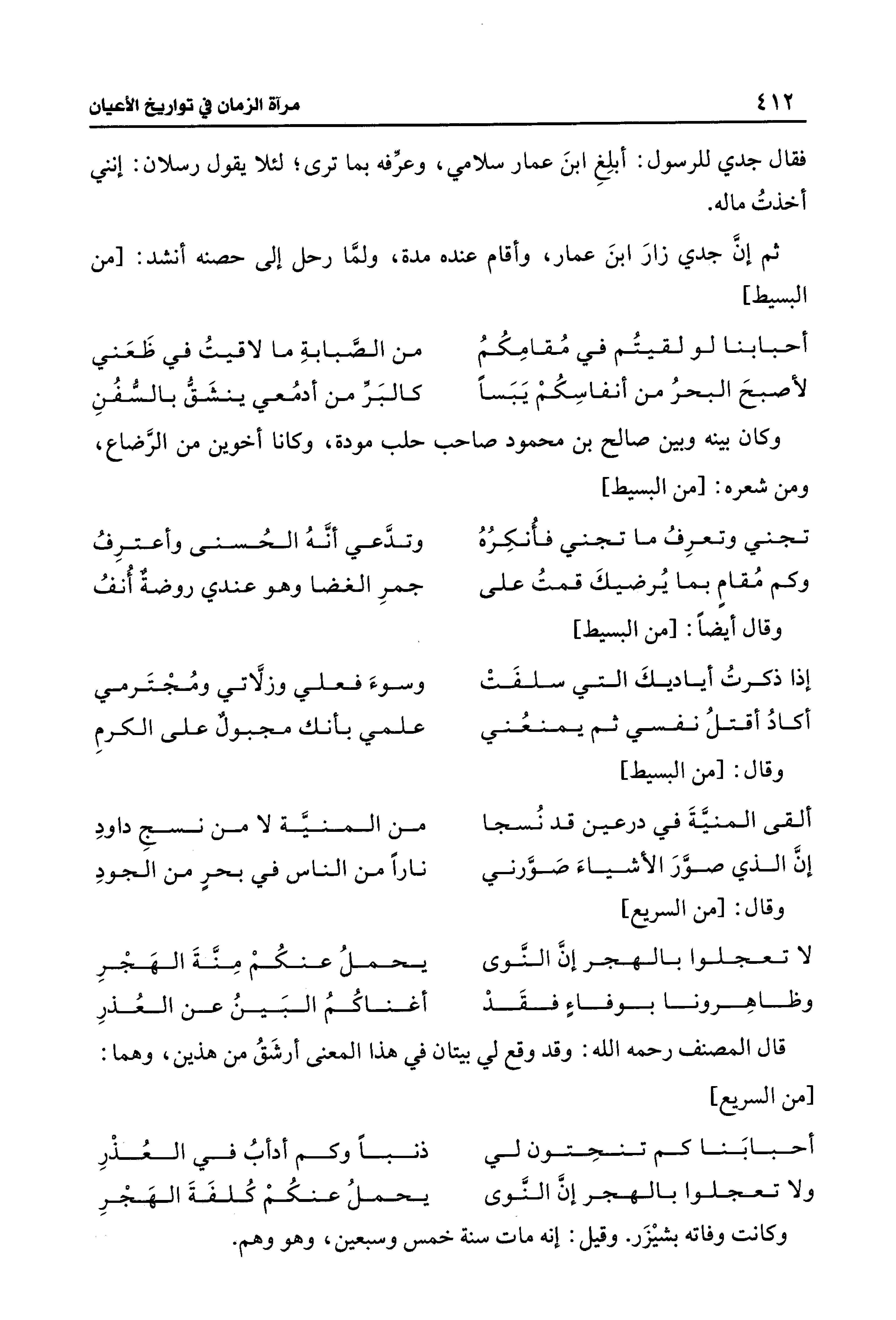 ثم إنَّ جدِّي زارَ ابنَ عمار، وأقام عنده مدة، ولمَّا رحل إلى حصنه أنشد: [من البسيط]