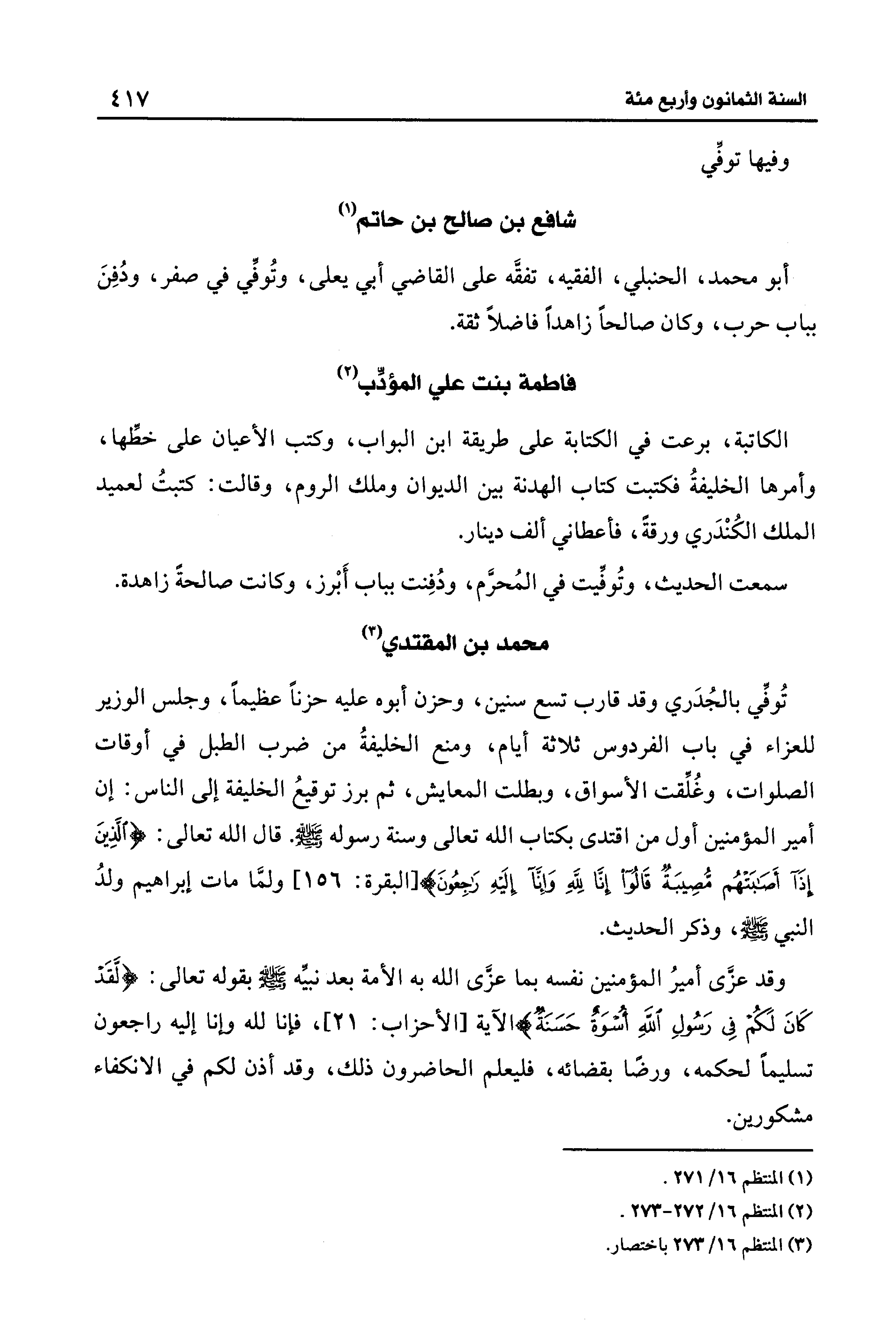 الكاتبة، برعت في الكتابة على طريقة ابن البواب، وكتب الأعيان على خطِّها، وأمرها الخليفةُ فكتبت كتاب الهدنة بين الديوان وملك الروم، وقالت: كتبتُ لعميد الملك الكُنْدَري ورقةً، فأعطاني ألف دينار.