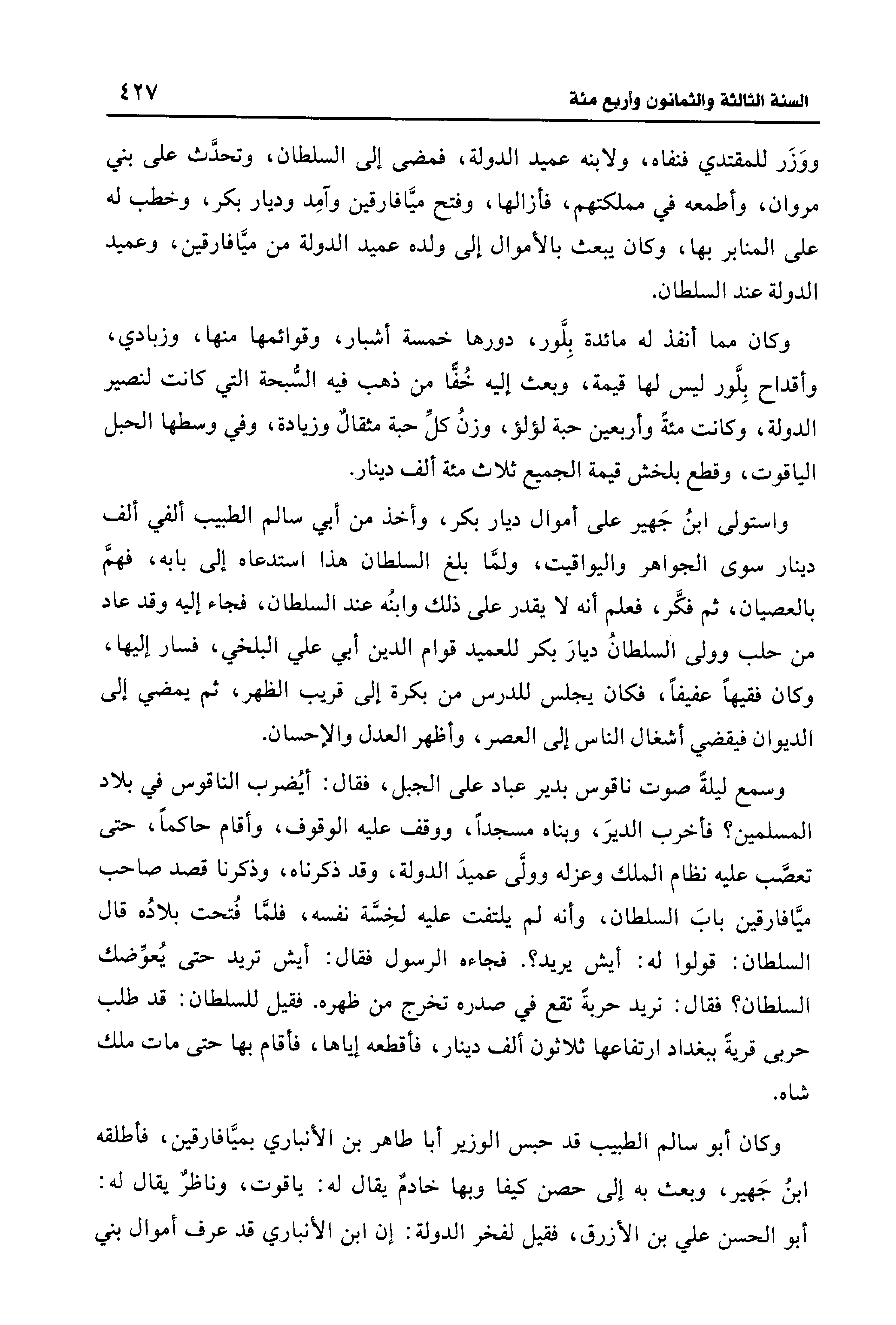 وكان مما أنفذ له مائدة بِلَّور، دورها خمسة أشبار، وقوائمها منها، وزبادي، وأقداح بِلَّور ليس لها قيمة، وبعث إليه خُفًّا من ذهب فيه السُّبحة التي كانت لنصير الدولة، وكانت مئة وأربعين حبة لؤلؤ، وزنُ كلِّ حبة مثقالٌ وزيادة، وفي وسطها الحبل الياقوت، وقطع بلخش قيمة الجميع ثلاث مئة ألف دينار.