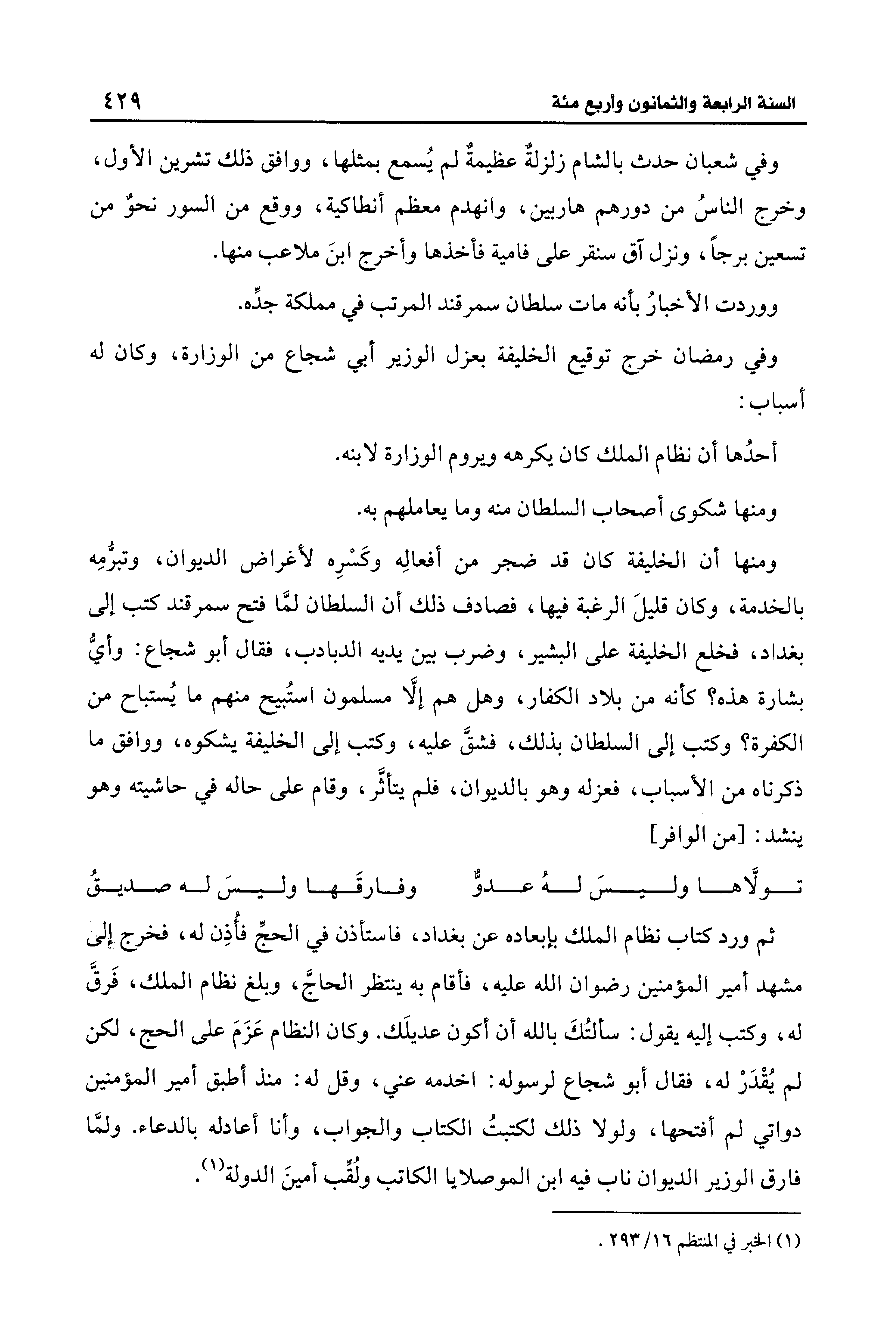 ومنها أن الخليفة كان قد ضجر من أفعالِه وكَسْرِه لأغراض الديوان، وتبرُّمِه بالخدمة، وكان قليلَ الرغبة فيها، فصادف ذلك أن السلطان لمَّا فتح سمرقند كتب إِلَى بغداد، فخلع الخليفة على البشير، وضرب بين يديه الدبادب، فقال أبو شجاع: وأيُّ بشارة هذه؟ كأنه من بلاد الكفار، وهل هم إلَّا مسلمون استُبيح منهم ما يُستباح من الكفرة؟ وكتب إِلَى السلطان بذلك، فشقَّ عليه، وكتب إِلَى الخليفة يشكوه، ووافق ما ذكرناه من الأسباب، فعزله وهو بالديوان، فلم يتأثَّر، وقام على حالة فِي حاشيته وهو ينشد: [من الوافر]