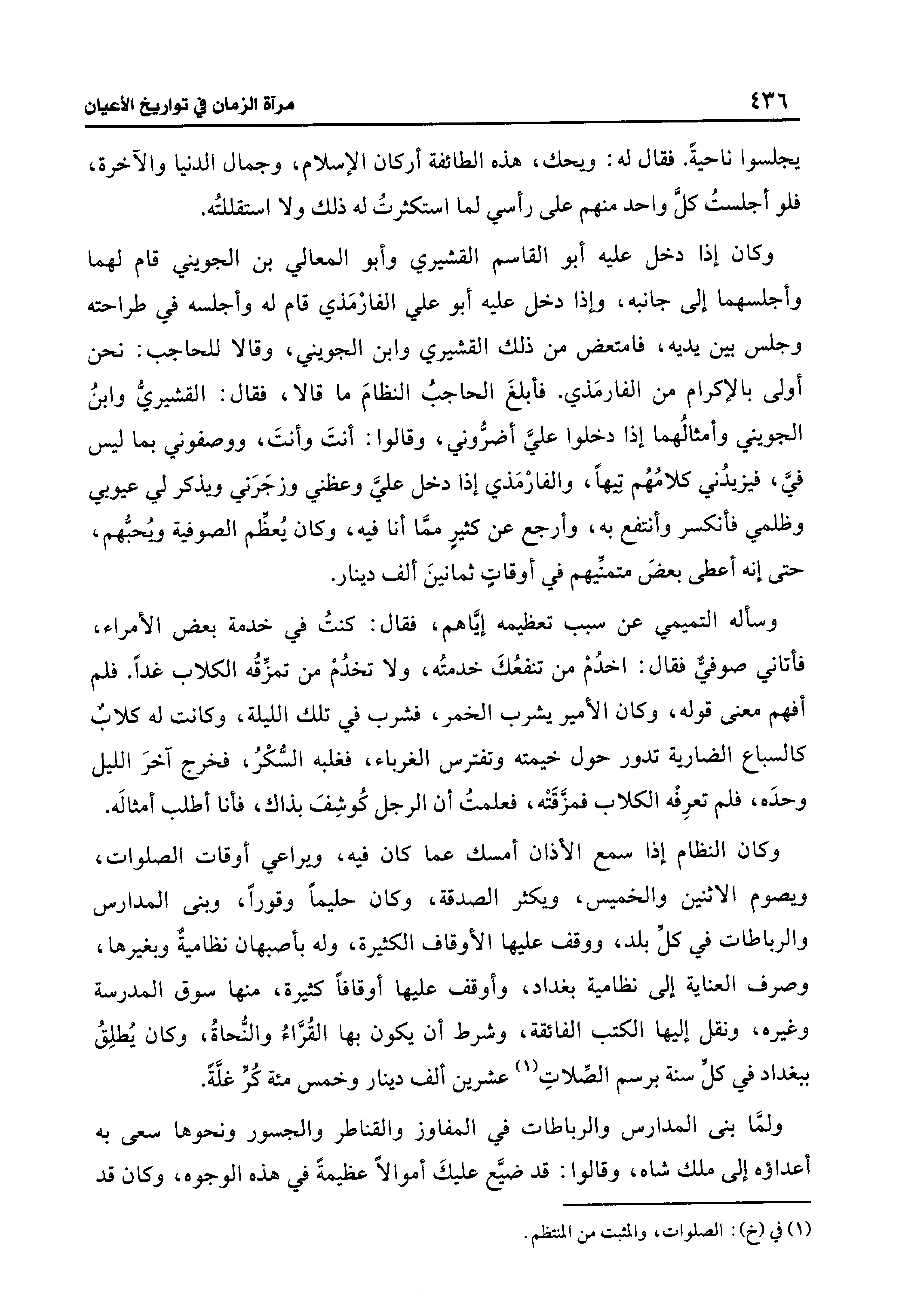 وكان النظام إذا سمع الأذان أمسك عما كان فيه، ويراعي أوقات الصلوات، ويصوم الاثنين والخميس، ويكثر الصدقة، وكان حليمًا وقورًا، وبنى المدارس والرباطات فِي كلِّ بلد، ووقف عليها الأوقاف الكثيرة، وله بأصبهان نظاميةٌ وبغيرها، وصرف العناية إِلَى نظامية بغداد، وأوقف عليها أوقافًا كثيرة، منها سوق المدرسة وغيره، ونقل إليها الكتب الفائقة، وشرط أن يكون بها القُرَّاءُ والنُّحاةُ، وكان يُطلِقُ ببغداد فِي كلِّ سنة برسم الصِّلاتِ (¬1) عشرين أَلْف دينار وخمس مئة كُرٍّ غلَّةً.