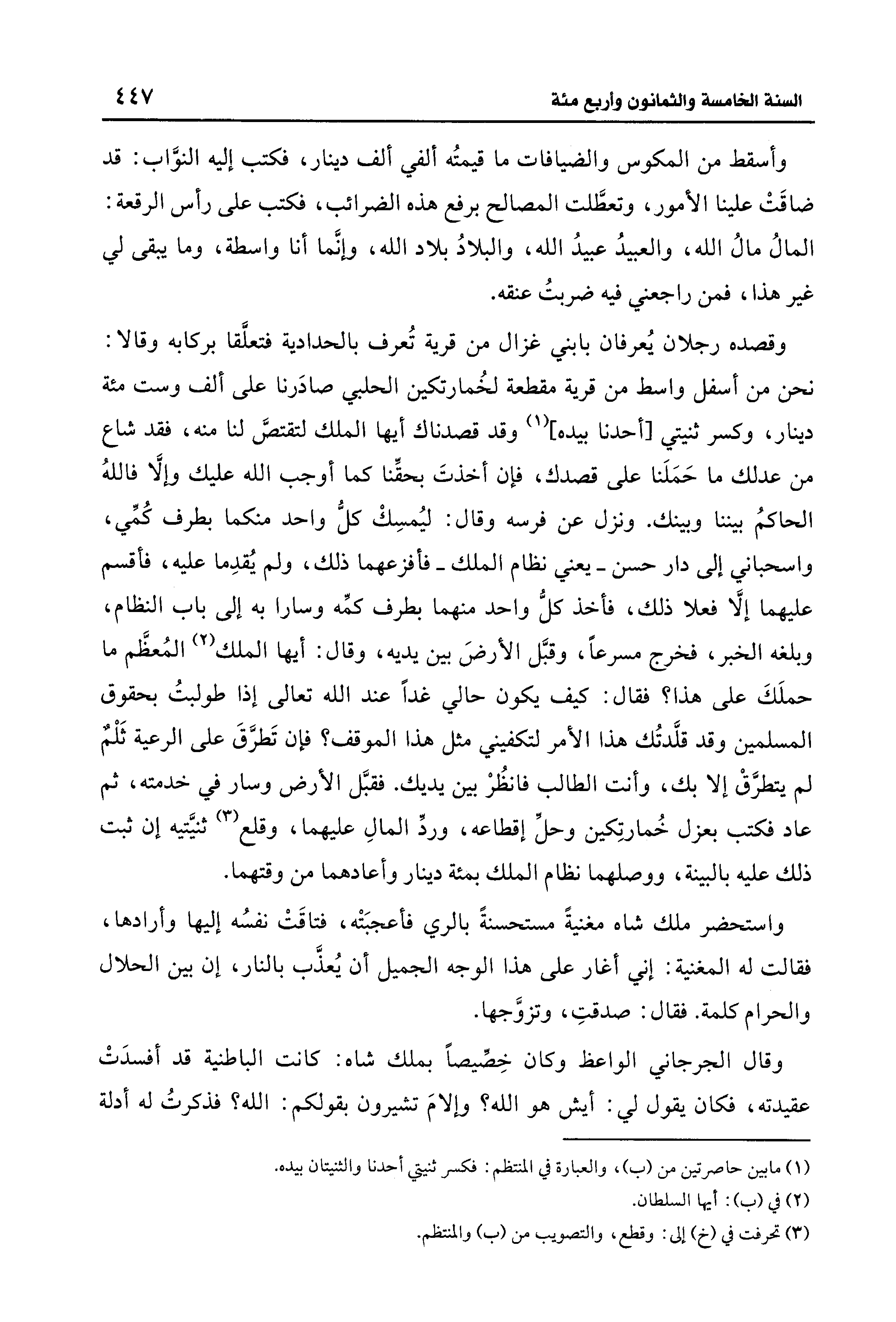 وأسقط من المكوس والضيافات ما قيمتُه ألفي أَلْف دينار، فكتب إليه النوَّاب: قد ضاقَتْ علينا الأمور، وتعطَّلت المصالح برفع هذه الضرائب، فكتب على رأس الرقعة: المالُ مالُ الله، والعبيدُ عبيدُ الله، والبلادُ بلاد الله، وإنَّما أنا واسطة، وما يبقى لي غير هذا، فمن راجعني فيه ضربتُ عنقه.