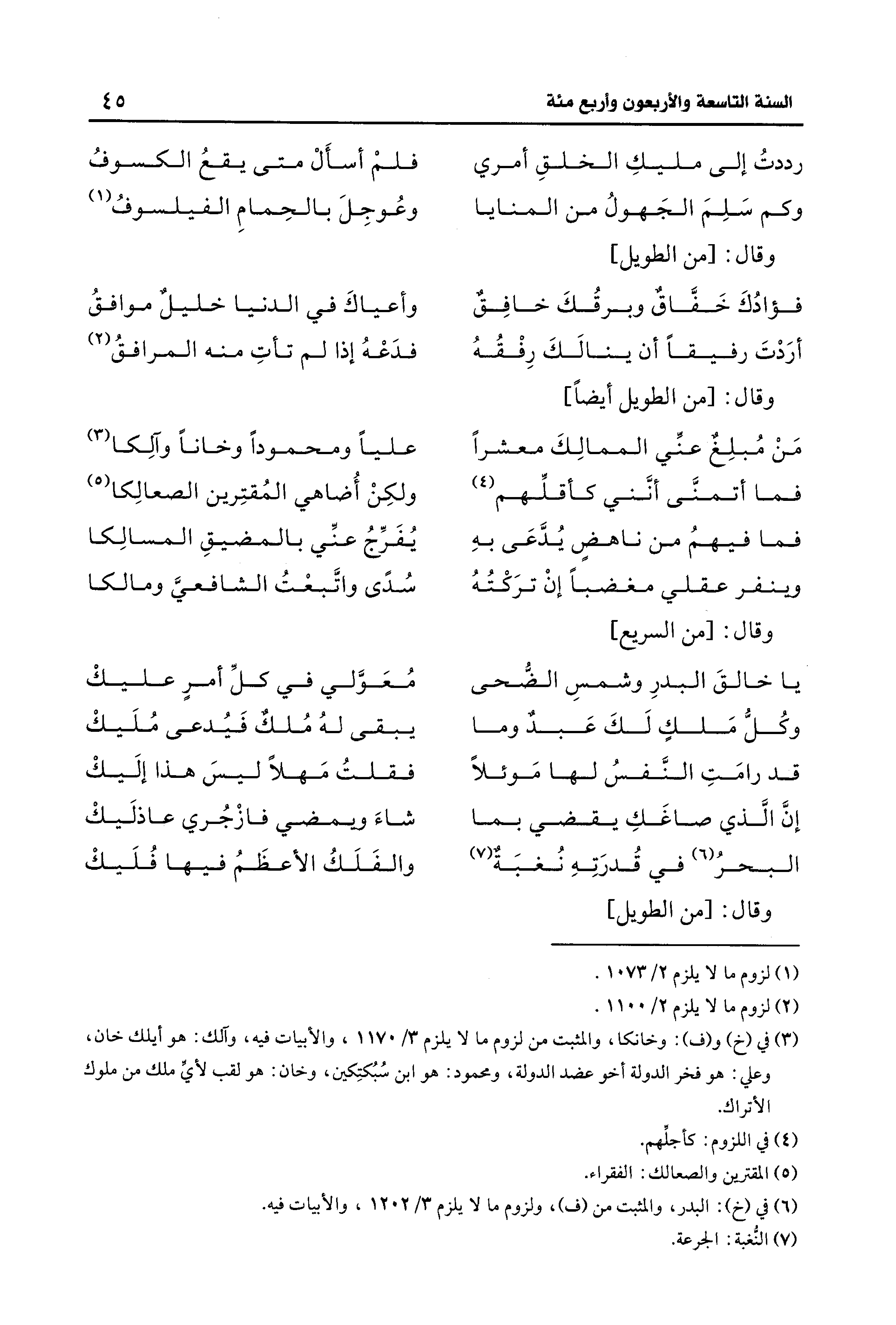 (¬3) في (خ) و (ف): وخانكا، والمثبت من لزوم ما لا يلزم 3/ 1170، والأبيات فيه، وآلك: هو أيلك خان، وعلي: هو فخر الدولة أخو عضد الدولة، ومحمود: هو ابن سُبُكتِكين، وخان: هو لقب لأيِّ ملك من ملوك الأتراك.