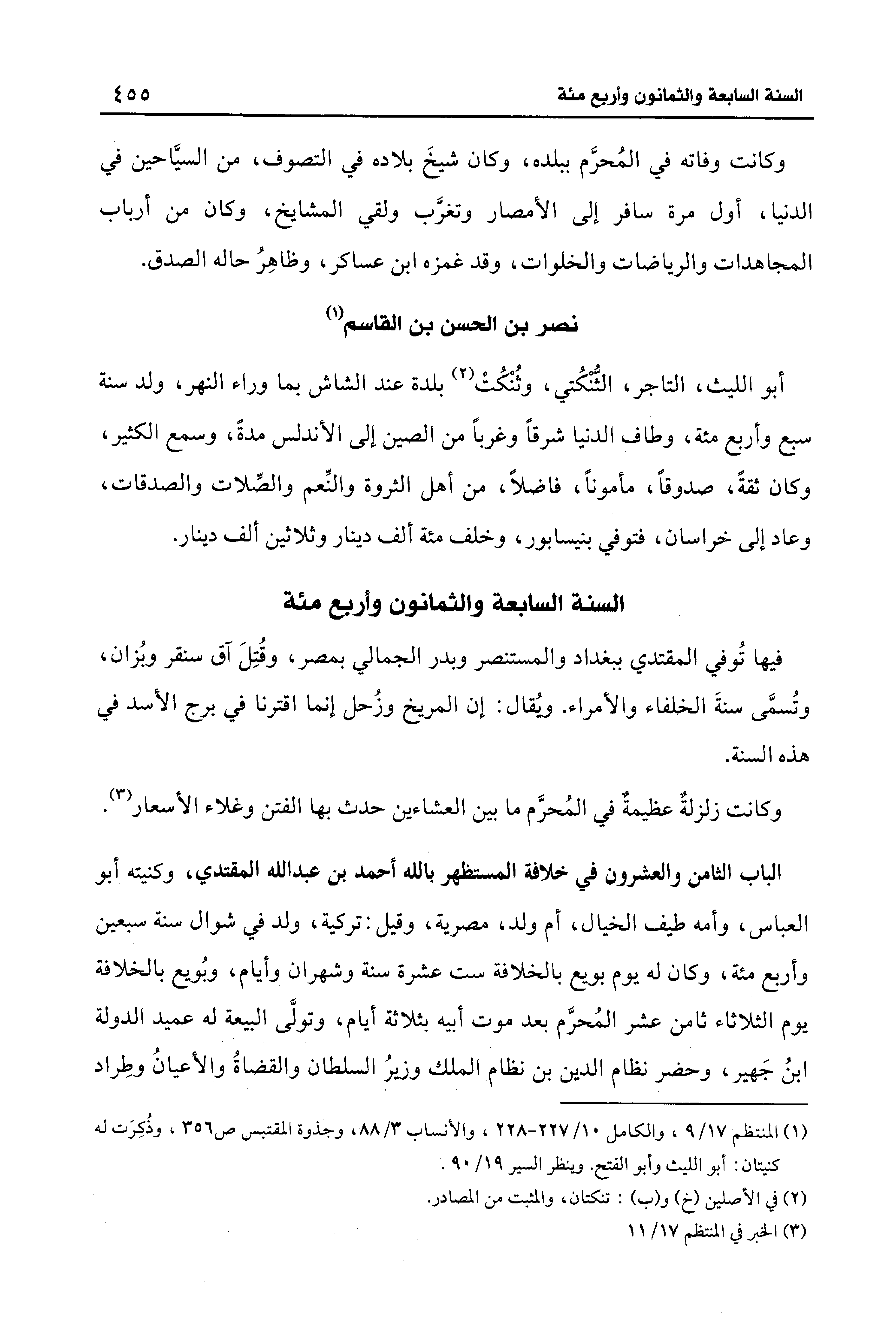 (¬1) المنتظم 17/ 9، والكامل 10/ 227 - 228، والأنساب 3/ 88، وجذوة المقتبس ص 356، وذُكِرَت له كنيتان: أبو الليث وأبو الفتح. وينظر السير 19/ 90.