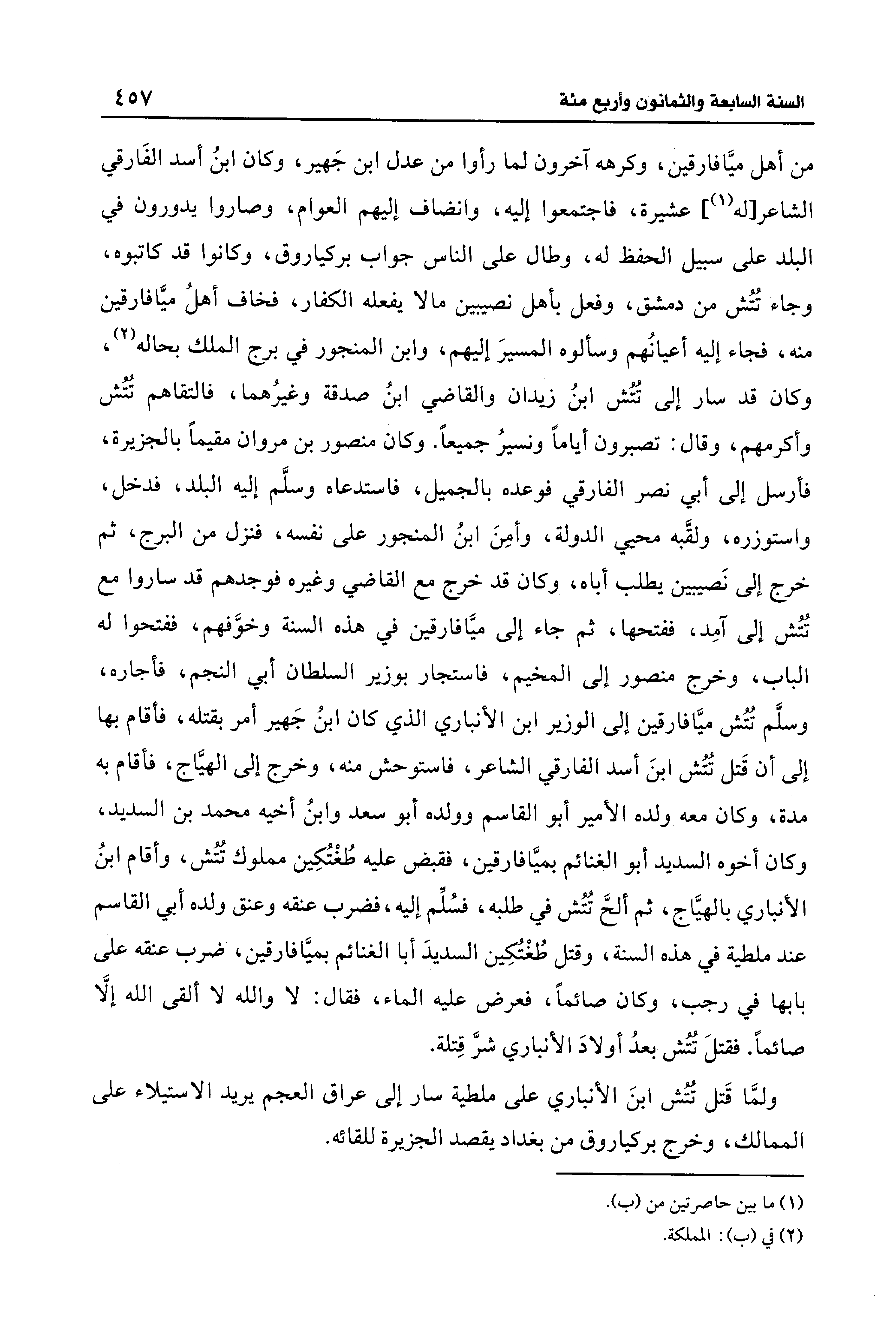 من أهل ميَّافارقين، وكرهه آخرون لما رأوا من عدل ابن جَهير، وكان ابنُ أسد الفَارقي الشاعر [له (¬1)] عشيرة، فاجتمعوا إليه، وانضاف إليهم العوام، وصاروا يدورون فِي البلد على سبيل الحفظ له، وطال على النَّاس جواب بركياروق، وكانوا قد كاتبوه، وجاء تُتُش من دمشق، وفعل بأهل نصيبين ما لا يفعله الكفار، فخاف أهلُ ميَّافارقين منه، فجاء إليه أعيانُهم وسألوه المسيرَ إليهم، وابن المنجور فِي برج الملك بحاله (¬2)، وكان قد سار إِلَى تُتُش ابنُ زيدان والقاضي ابنُ صدقة وغيرُهما، فالتقاهم تُتُش وأكرمهم، وقال: تصبرون أيامًا ونسيرُ جميعًا. وكان منصور بن مروان مقيمًا بالجزيرة، فأرسل إِلَى أبي نصر الفارقي فوعده بالجميل، فاستدعاه وسلَّم إليه البلد، فدخل، واستوزره، ولقَّبه محيي الدولة، وأمِنَ ابنُ المنجور على نفسه، فنزل من البرج، ثم خرج إِلَى نَصيبين يطلب أباه، وكان قد خرج مع القاضي وغيره فوجدهم قد ساروا مع تُتُش إِلَى آمِد، ففتحها، ثم جاء إِلَى ميَّافارقين فِي هذه السنة وخوَّفهم، ففتحوا له الباب، وخرج منصور إِلَى المخيم، فاستجار بوزير السلطان أبي النجم، فأجاره، وسلَّم تُتُش ميَّافارقين إِلَى الوزير ابن الأنباري الذي كان ابنُ جَهير أمر بقتله، فأقام بها إِلَى أن قَتل تُتُش ابنَ أسد الفارقي الشَّاعر، فاستوحش منه، وخرج إِلَى الهيَّاج، فأقام به مدة، وكان معه ولده الأمير أبو القاسم وولده أبو سعد وابنُ أخيه محمَّد بن السديد، وكان أخوه السديد أبو الغنائم بميَّافارقين، فقبض عليه طُغْتُكِين مملوك تُتُش، وأقام ابنُ الأنباري بالهيَّاج، ثم ألحَّ تُتُش فِي طلبه، فسُلِّم إليه، فضرب عنقه وعنق ولده أبي القاسم عند ملطية فِي هذه السنة، وقتل طُغْتُكِين السديدَ أَبا الغنائم بميَّافارقين، ضرب عنقه على بابها فِي رجب، وكان صائمًا، فعرض عليه الماء، فقال: لا والله لا ألقى الله إلَّا صائمًا. فقتلَ تُتُش بعدُ أولادَ الأنباري شرَّ قِتلة.