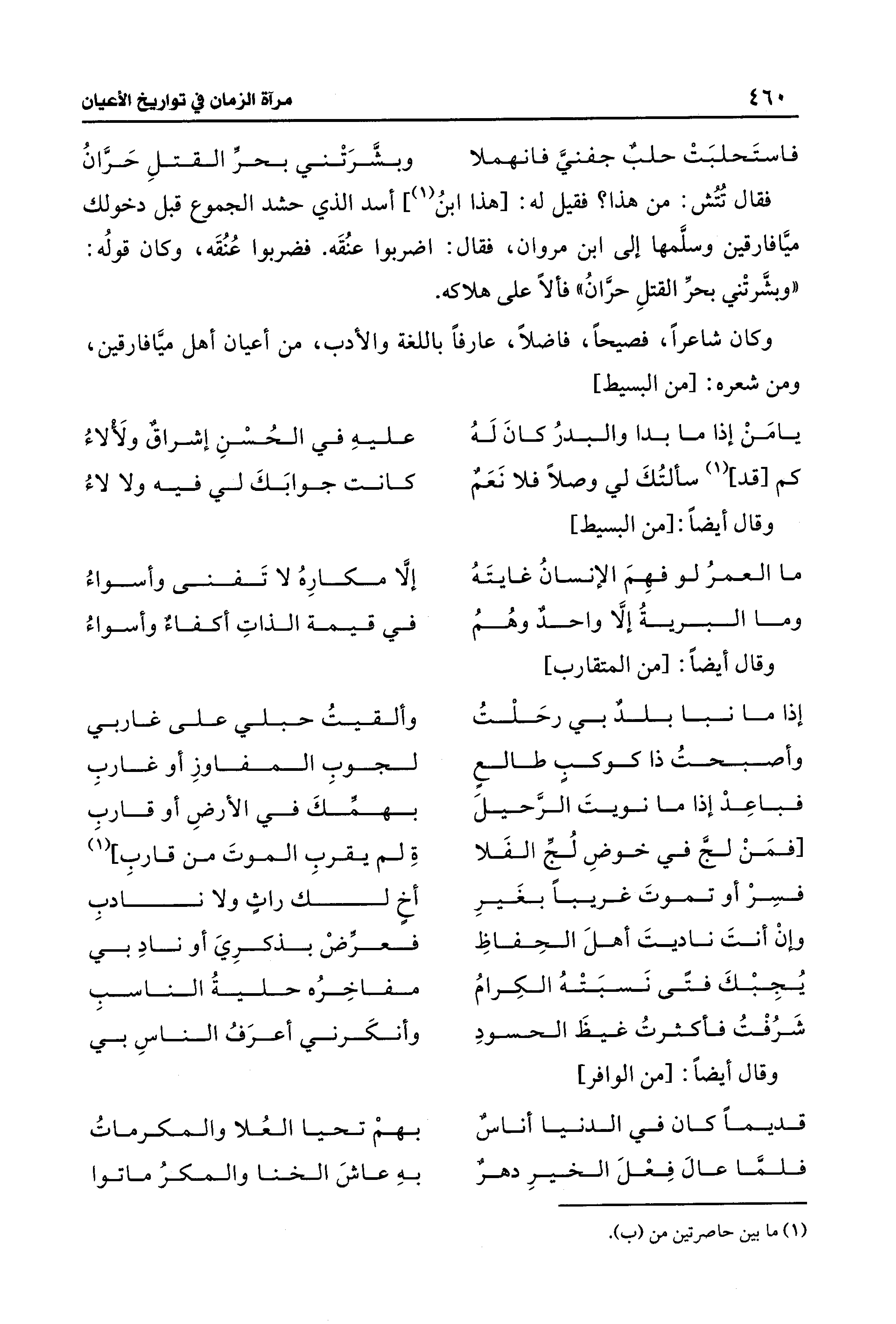 وكان شاعرًا، فصيحًا، فاضلًا، عارفًا باللغة والأدب، من أعيان أهل ميَّافارقين، ومن شعره: [من البسيط]