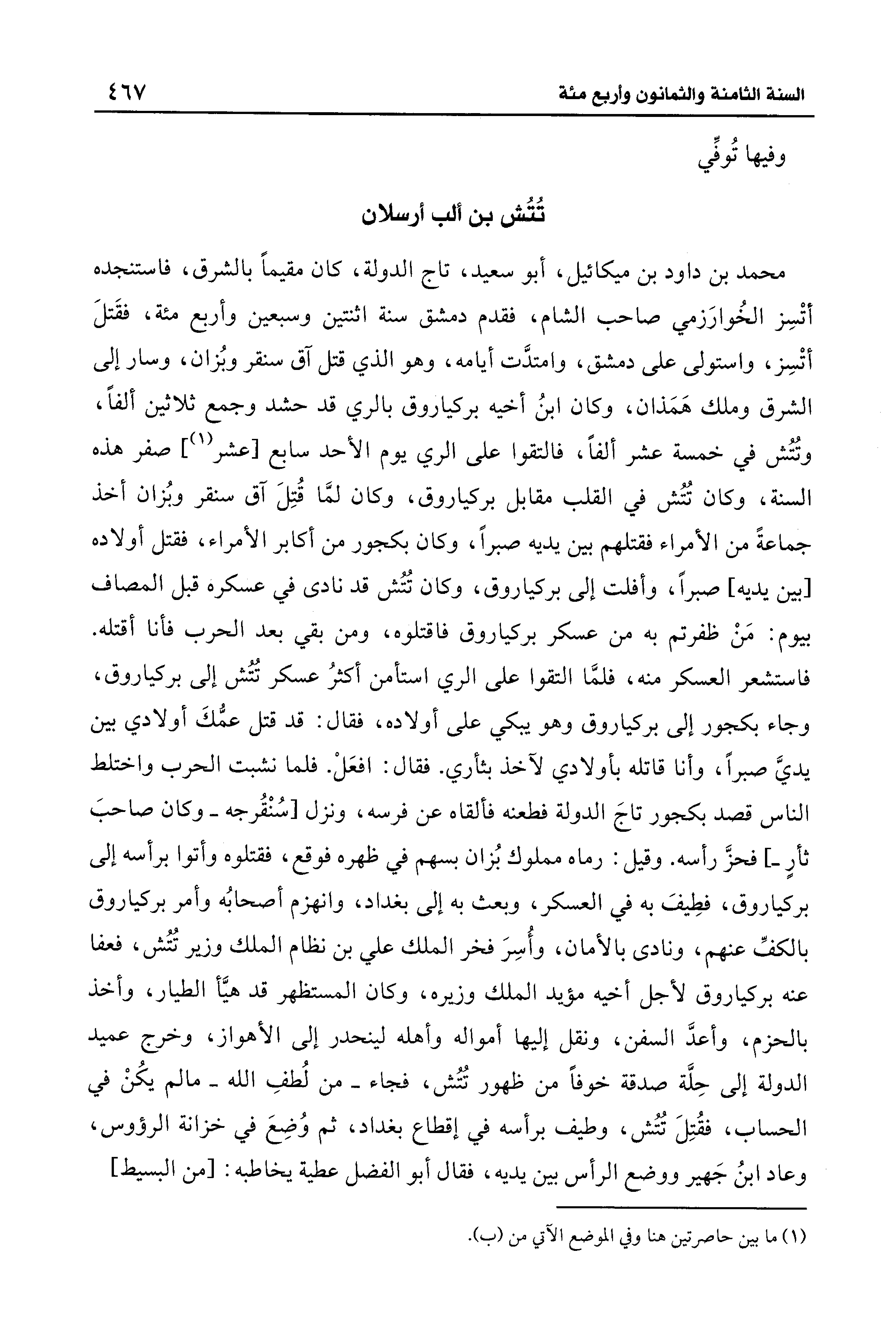 محمَّد بن داود بن ميكائيل، أبو سعيد، تاج الدولة، كان مقيمًا بالشرق، فاستنجده أتْسِز الخُوارَزمي صاحب الشَّام، فقدم دمشق سنة اثنتين وسبعين وأربع مئة، فقَتلَ أتْسِز، واستولى على دمشق، وامتدَّت أيامه، وهو الذي قتل آق سنقر وبُزان، وسار إِلَى الشرق وملك هَمَذان، وكان ابنُ أخيه بركياروق بالري قد حشد وجمع ثلاثين ألفًا، وتُتُش فِي خمسة عشر ألفًا، فالتقوا على الري يوم الأحد سابع [عشر (¬1)] صفر هذه السنة، وكان تُتُش فِي القلب مقابل بركياروق، وكان لمَّا قُتِلَ آق سنقر وبُزان أخذ جماعةً من الأمراء فقتلهم بين يديه صبرًا، وكان بكجور من أكابر الأمراء، فقتل أولاده [بين يديه] صبرًا، وأفلت إِلَى بركياروق، وكان تُش قد نادى فِي عسكره قبل المصاف بيوم: مَنْ ظفرتم به من عسكر بركياروق فاقتلوه، ومن بقي بعد الحرب فأنا أقتله. فاستشعر العسكر منه، فلمَّا التقوا على الري استأمن أكثرُ عسكر تُتُش إِلَى بركياروق، وجاء بكجور إِلَى بركياروق وهو يبكي على أولاده، فقال: قد قتل عمُّكَ أولادي بين يديَّ صبرًا، وأنا قاتله بأولادي لآخذ بثأري. فقال: افعَلْ. فلما نشبت الحرب واختلط النَّاس قصد بكجور تاجَ الدولة فطعنه فألقاه عن فرسه، ونزل [سُنْقُرجه -وكان صاحبَ ثأرٍ-] فحزَّ رأسه. وقيل: رماه مملوك بُزان بسهم فِي ظهره فوقع، فقتلوه وأتوا برأسه إِلَى بركياروق، فطِيفَ به فِي العسكر، وبعث به إِلَى بغداد، وانهزم أصحابُه وأمر بركياروق بالكفِّ عنهم، ونادى بالأمان، وأُسِرَ فخر الملك علي بن نظام الملك وزير تُتُش، فعفا عنه بركياروق لأجل أخيه مؤيد الملك وزيره، وكان المستظهر قد هيَّأ الطيار، وأخذ بالحزم، وأعدَّ السفن، ونقل إليها أمواله وأهله لينحدر إِلَى الأهواز، وخرج عميد الدولة إِلَى حِلَّة صدقة خوفًا من ظهور تُتُش، فجاء - من لُطفِ الله - ما لم يكُنْ فِي الحساب، فقُتِلَ تُتُش، وطيف برأسه فِي إقطاع بغداد، ثم وُضِعَ فِي خزانة الرؤوس، وعاد ابنُ جَهير ووضع الرأس بين يديه، فقال أبو الفضل عطية يخاطبه: [من البسيط]
