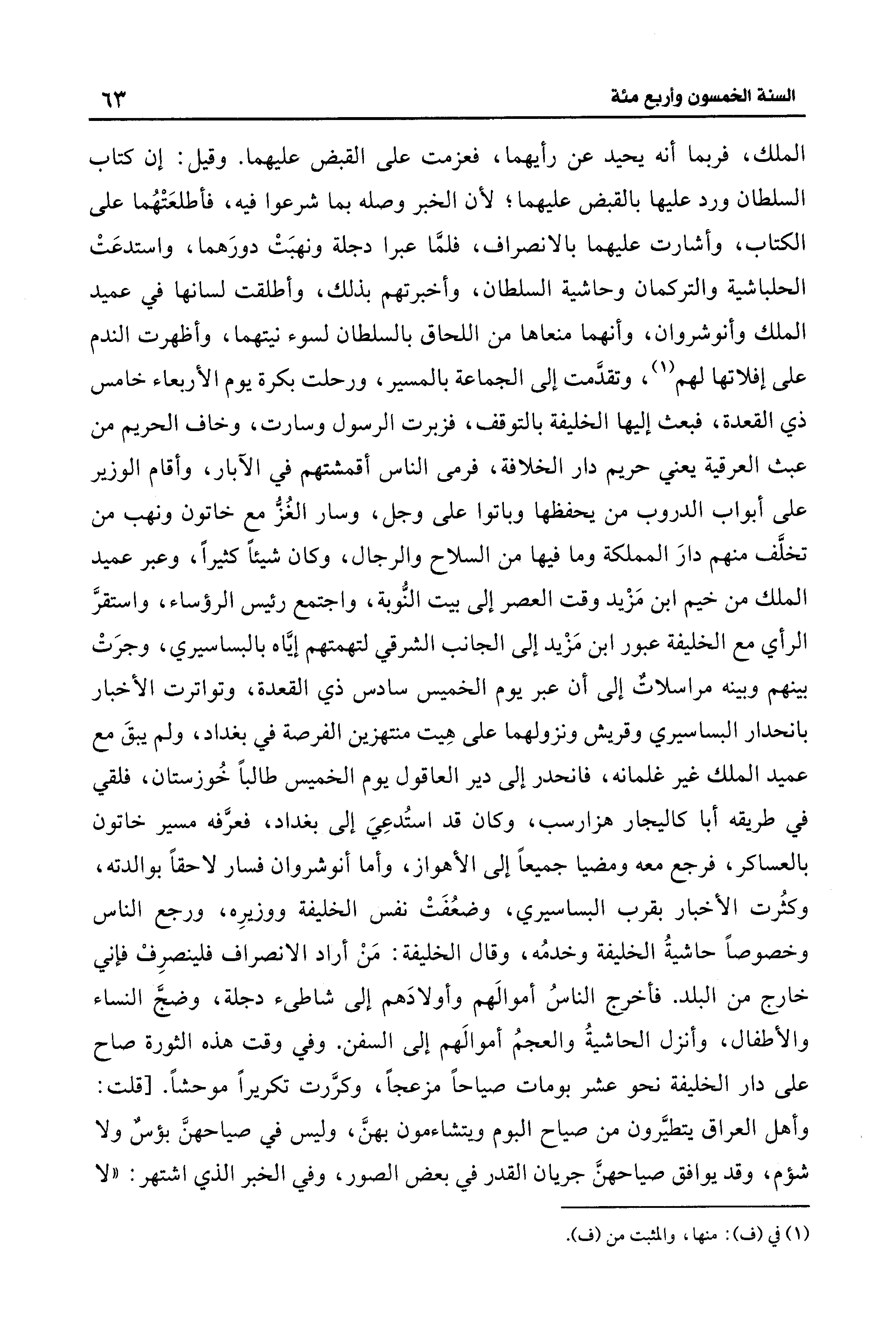 الملك، فربما أنه يحيد عن رأيهما، فعزمت على القبض عليهما. وقيل: إن كتاب السلطان ورد عليها بالقبض عليهما؛ لأن الخبر وصله بما شرعوا فيه، فأطلعَتْهُما على الكتاب، وأشارت عليهما بالانصراف، فلمَّا عبرا دجلة ونهبَتْ دورَهما، واستدعَتْ الحلباشية والتركمان وحاشية السلطان، وأخبرتهم بذلك، وأطلقت لسانها في عميد الملك وأنوشروان، وأنهما منعاها من اللحاق بالسلطان لسوء نيتهما، وأظهرت الندم على إفلاتها لهم (¬1)، وتقدَّمت إلى الجماعة بالمسير، ورحلت بكرة يوم الأربعاء خامس ذي القعدة، فبعث إليها الخليفة بالتوقف، فزبرت الرسول وسارت، وخاف الحريم من عبث العرقية يعني حريم دار الخلافة، فرمى الناس أقمشتهم في الآبار، وأقام الوزير على أبواب الدروب من يحفظها وباتوا على وجل، وسار الغُزُّ مع خاتون ونهب من تخلَّف منهم دارَ المملكة وما فيها من السلاح والرجال، وكان شيئًا كثيرًا، وعبر عميد الملك من خيم ابن مَزْيد وقت العصر إلى بيت النُّوبة، واجتمع رئيس الرؤساء، واستقرَّ الرأي مع الخليفة عبور ابن مَزْيد إلى الجانب الشرقي لتهمتهم إيَّاه بالبساسيري، وجرَتْ بينهم وبينه مراسلاتٌ إلى أن عبر يوم الخميس سادس ذي القعدة، وتواترت الأخبار بانحدار البساسيري وقريش ونزولهما على هِيت منتهزين الفرصة في بغداد، ولم يبقَ مع عميد الملك غير غلمانه، فانحدر إلى دير العاقول يوم الخميس طالبًا خُوزستان، فلقي في طريقه أبا كاليجار هزارسب، وكان قد استُدعِيَ إلى بغداد، فعرَّفه مسير خاتون بالعساكر، فرجع معه ومضيا جميعًا إلى الأهواز، وأما أنوشروان فسار لاحقًا بوالدته، وكثُرت الأخبار بقرب البساسيري، وضعُفَتْ نفس الخليفة ووزيرِه، ورجع الناس وخصوصًا حاشيةُ الخليفة وخدمُه، وقال الخليفة: مَنْ أراد الانصراف فلينصرِفْ فإني خارج من البلد. فأخرج الناسُ أموالهم وأولادَهم إلى شاطئ دجلة، وضجَّ النساء والأطفال، وأنزل الحاشيةُ والعجمُ أموالهم إلى السفن. وفي وقت هذه الثورة صاح على دار الخليفة نحو عشر بومات صياحًا مزعجًا، وكرَّرت تكريرًا موحشًا. [قلت: وأهل العراق يتطيَّرون من صياح البوم ويتشاءمون بهنَّ، وليس في صياحهنَّ بؤسٌ ولا شؤم، وقد يوافق صياحهنَّ جريان القدر في بعض الصور، وفي الخبر الذي اشتهر: "لا