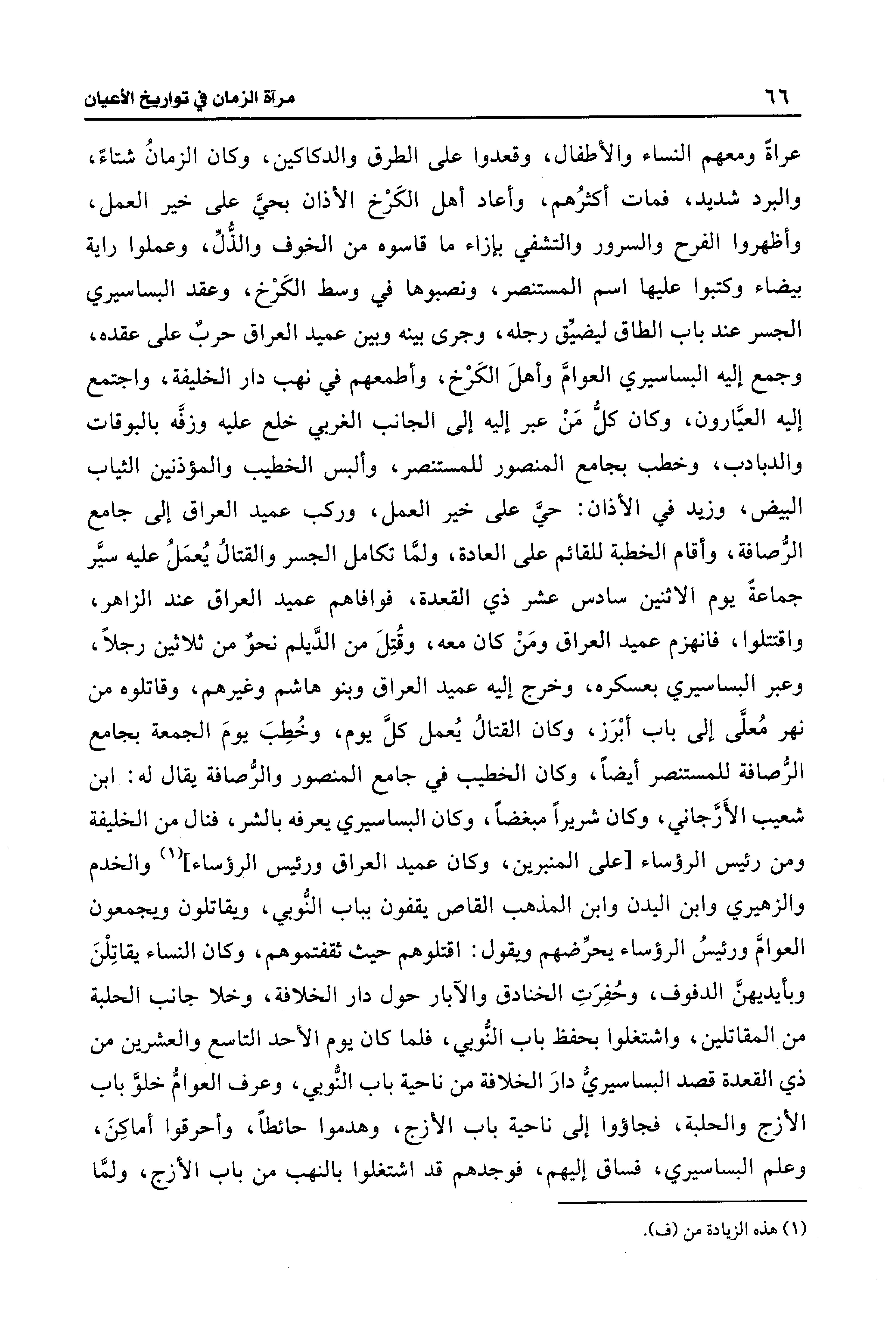 عراةً ومعهم النساء والأطفال، وقعدوا على الطرق والدكاكين، وكان الزمانُ شتاءً، والبرد شديد، فمات أكثرُهم، وأعاد أهل الكَرْخ الأذان بحيَّ على خير العمل، وأظهروا الفرح والسرور والتشفي بإزاء ما قاسوه من الخوف والذُّلِّ، وعملوا راية بيضاء وكتبوا عليها اسم المستنصر، ونصبوها في وسط الكَرْخ، وعقد البساسيري الجسر عند باب الطاق ليضيِّق رجله، وجرى بينه وبين عميد العراق حربٌ على عقده، وجمع إليه البساسيري العوامَّ وأهلَ الكَرْخ، وأطمعهم في نهب دار الخليفة، واجتمع إليه العيَّارون، وكان كلُّ مَنْ عبر إليه إلى الجانب الغربي خلع عليه وزفَّه بالبوقات والدبادب، وخطب بجامع المنصور للمستنصر، وألبس الخطيب والمؤذنين الثياب البيض، وزيد في الأذان: حيَّ على خير العمل، وركب عميد العراق إلى جامع الرُّصافة، وأقام الخطبة للقائم على العادة، ولمَّا تكامل الجسر والقتالُ يُعمَلُ عليه سيَّر جماعةً يوم الاثنين سادس عشر ذي القعدة، فوافاهم عميد العراق عند الزاهر، واقتتلوا، فانهزم عميد العراق ومَنْ كان معه، وقُتِلَ من الدَّيلم نحو من ثلاثين رجلًا، وعبر البساسيري بعسكره، وخرج إليه عميد العراق وبنو هاشم وغيرهم، وقاتلوه من نهر مُعلَّى إلى باب أبْرَز، وكان القتالُ يُعمل كلَّ يوم، وخُطِبَ يومَ الجمعة بجامع الرُّصافة للمستنصر أيضًا، وكان الخطيب في جامع المنصور والرُّصافة يقال له: ابن شعيب الأَرَّجاني، وكان شريرًا مبغضًا، وكان البساسيري يعرفه بالشر، فنال من الخليفة ومن رئيس الرؤساء [على المنبرين، وكان عميد العراق ورئيس الرؤساء] (¬1) والخدم والزهيري وابن اليدن وابن المذهب القاص يقفون بباب النُّوبي، ويقاتلون ويجمعون العوامَّ ورئيسُ الرؤساء يحرِّضهم ويقول: اقتلوهم حيث ثقفتموهم، وكان النساء يقاتِلْنَ وبأيديهنَّ الدفوف، وحُفِرَتِ الخنادق والآبار حول دار الخلافة، وخلا جانب الحلية من المقاتلين، واشتغلوا بحفظ باب النُّوبي، فلما كان يوم الأحد التاسع والعشرين من ذي القعدة قصد البساسيريُّ دارَ الخلافة من ناحية باب النُّوبي، وعرف العوامُّ خلوَّ باب الأزج والحلبة، فجاؤوا إلى ناحية باب الأزج، وهدموا حائطًا، وأحرقوا أماكِنَ، وعلم البساسيري، فساق إليهم، فوجدهم قد اشتغلوا بالنهب من باب الأزج، ولمَّا
