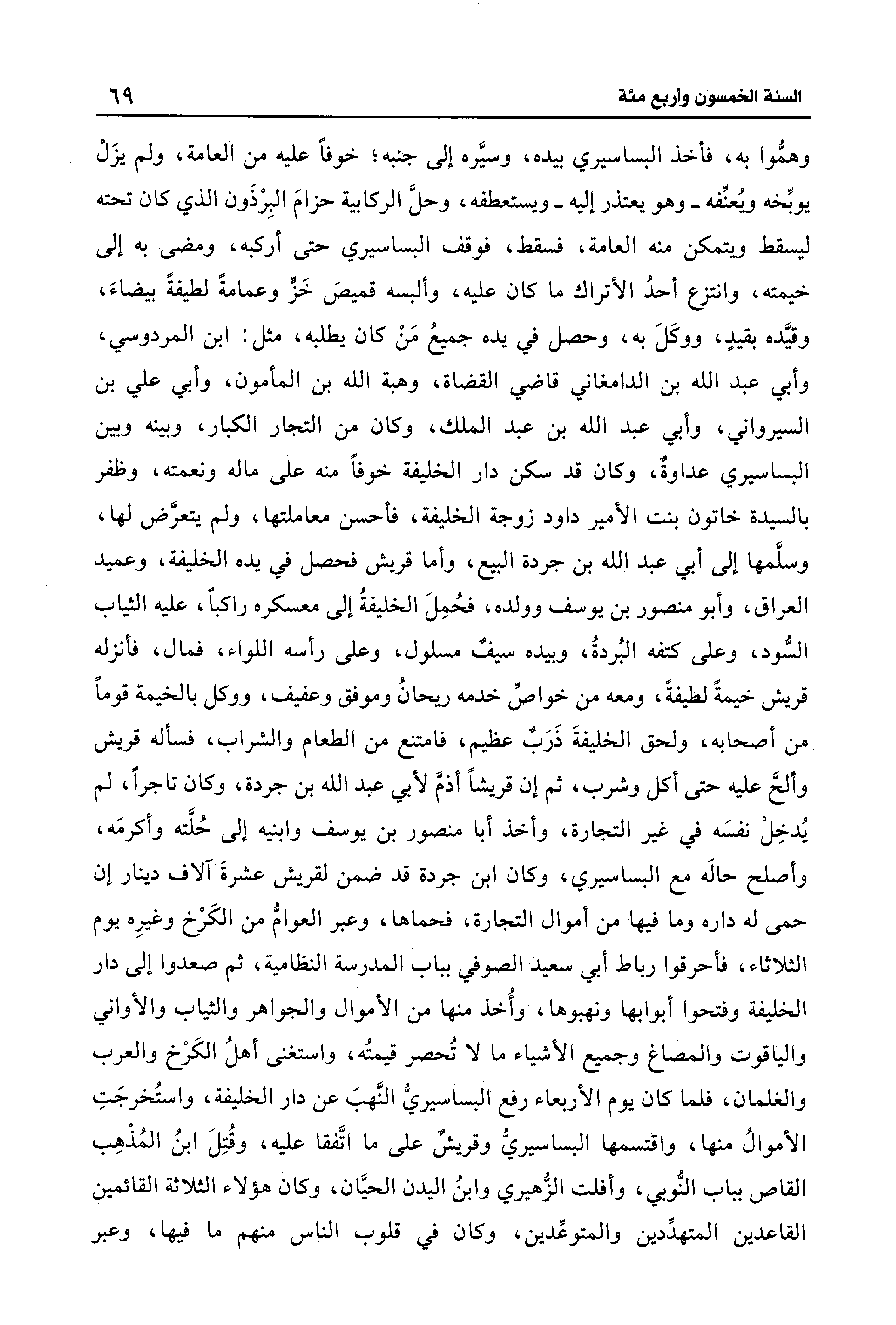 وهمُّوا به، فأخذ البساسيري بيده، وسيَّره إلى جنبه؛ خوفًا عليه من العامة، ولم يزَلْ يوبِّخه ويُعنِّفه -وهو يعتذر إليه- ويستعطفه، وحلَّ الركابية حزامَ البِرْذَون الذي كان تحته ليسقط ويتمكن منه العامة، فسقط، فوقف البساسيري حتى أركبه، ومضى به إلى خيمته، وانتزع أحدُ الأتراك ما كان عليه، وألبسه قميصَ خَزٍّ وعمامةً لطيفةً بيضاءَ، وقيَّده بقيدٍ، ووكَلَ به، وحصل في يده جميعُ مَنْ كان يطلبه، مثل: ابن المردوسي، وأبي عبد الله بن الدامغاني قاضي القضاة، وهبة الله بن المأمون، وأبي علي بن السيرواني، وأبي عبد الله بن عبد الملك، وكان من التجار الكبار، وبينه وبين البساسيري عداوةٌ، وكان قد سكن دار الخليفة خوفًا منه على ماله ونعمته، وظفر بالسيدة خاتون بنت الأمير داود زوجة الخليفة، فأحسن معاملتها، ولم يتعرَّض لها، وسلَّمها إلى أبي عبد الله بن جردة البيع، وأما قريش فحصل في يده الخليفة، وعميد العراق، وأبو منصور بن يوسف وولده، فحُمِلَ الخليفةُ إلى معسكره راكبًا، عليه الثياب السُّود، وعلى كتفه البُردةُ، وبيده سيفٌ مسلول، وعلى رأسه اللواء، فمال، فأنزله قريش خيمةً لطيفةً، ومعه من خواصِّ خدمه ريحانُ وموفق وعفيف، ووكل بالخيمة قومًا من أصحابه، ولحق الخليفةَ ذَرَبٌ عظيم، فامتنع من الطعام والشراب، فسأله قريش وألحَّ عليه حتى أكل وشرب، ثم إن قريشًا أذمَّ لأبي عبد الله بن جردة، وكان تاجرًا، لم يُدخِلْ نفسَه في غير التجارة، وأخذ أبا منصور بن يوسف وابنيه إلى حُلَّته وأكرمَه، وأصلح حاله مع البساسيري، وكان ابن جردة قد ضمن لقريش عشرةَ آلاف دينار إن حمى له داره وما فيها من أموال التجارة، فحماها، وعبر العوامُّ من الكَرْخ وغيرِه يوم الثلاثاء، فأحرقوا رباط أبي سعيد الصوفي بباب المدرسة النظامية، ثم صعدوا إلى دار الخليفة وفتحوا أبوابها ونهبوها، وأُخذ منها من الأموال والجواهر والثياب والأواني والياقوت والمصاغ وجميع الأشياء ما لا تُحصر قيمتُه، واستغنى أهلُ الكَرْخ والعرب والغلمان، فلما كان يوم الأربعاء رفع البساسيريُّ النَّهبَ عن دار الخليفة، واستُخرجَتِ الأموالُ منها، واقتسمها البساسيريّ وقريشٌ على ما اتَّفقا عليه، وقُتِلَ ابنُ المُذْهِب القاص بباب النُّوبي، وأفلت الزُّهيري وابنُ اليدن الحيَّان، وكان هؤلاء الثلاثة القائمين القاعدين المتهدِّدين والمتوعِّدين، وكان في قلوب الناس منهم ما فيها، وعبر