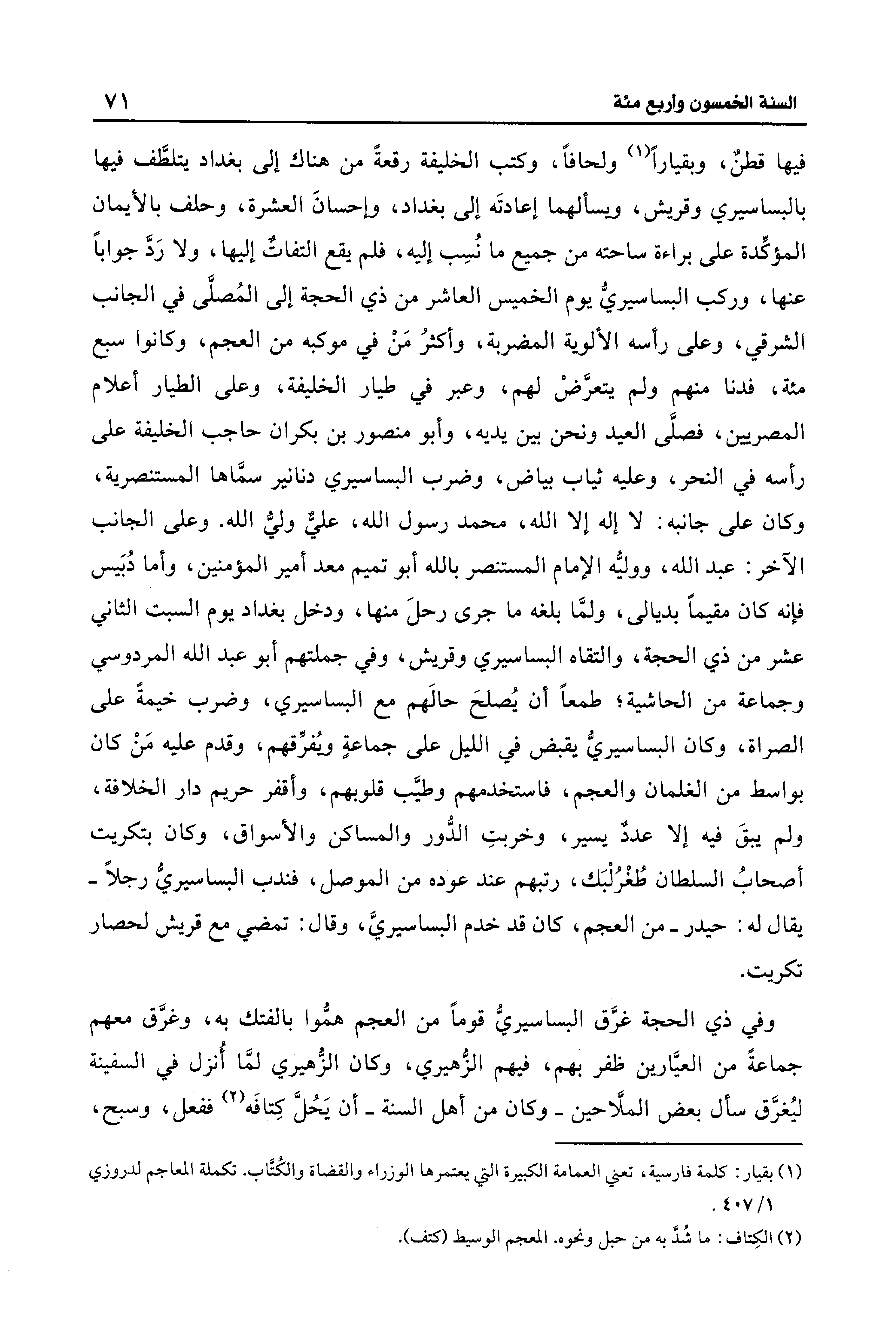 فيها قطنٌ، وبقيارًا (¬1) ولحافًا، وكتب الخليفة رقعةً من هناك إلى بغداد يتلطَّف فيها بالبساسيري وقريش، ويسألهما إعادتَه إلى بغداد، وإحسانَ العشرة، وحلف بالأيمان المؤكِّدة على براءة ساحته من جميع ما نُسِب إليه، فلم يقع التفات إليها، ولا رَدَّ جوابًا عنها، وركب البساسيريُّ يوم الخميس العاشر من ذي الحجة إلى المُصلَّى في الجانب الشرقي، وعلى رأسه الألوية المضربة، وأكثرُ مَنْ في موكبه من العجم، وكانوا سبع مئة، فدنا منهم ولم يتعرَّضْ لهم، وعبر في طيار الخليفة، وعلى الطيار أعلام المصريين، فصلَّى العيد ونحن بين يديه، وأبو منصور بن بكران حاجب الخليفة على رأسه في النحر، وعليه ثياب بياض، وضرب البساسيري دنانير سمَّاها المستنصرية، وكان على جانبه: لا إله إلا الله، محمد رسول الله، عليٌّ وليُّ الله. وعلى الجانب الآخر: عبد الله، ووليُّه الإمام المستنصر بالله أبو تميم معد أمير المؤمنين، وأما دُبَيس فإنه كان مقيمًا بديالى، ولمَّا بلغه ما جرى رحلَ منها، ودخل بغداد يوم السبت الثاني عشر من ذي الحجة، والتقاه البساسيري وقريش، وفي جملتهم أبو عبد الله المردوسي وجماعة من الحاشية؛ طمعًا أن يُصلحَ حالهم مع البساسيري، وضرب خيمةً على الصراة، وكان البساسيريُّ يقبض في الليل على جماعةٍ ويُفرِّقهم، وقدم عليه مَنْ كان بواسط من الغلمان والعجم، فاستخدمهم وطيَّب قلوبهم، وأقفر حريم دار الخلافة، ولم يبقَ فيه إلا عددٌ يسير، وخربتِ الدُّور والمساكن والأسواق، وكان بتكريت أصحابُ السلطان طُغْرُلْبَك، رتبهم عند عوده من الموصل، فندب البساسيريُّ رجلًا -يقال له: حيدر- من العجم، كان قد خدم البساسيريَّ، وقال: تمضي مع قريش لحصار تكريت.