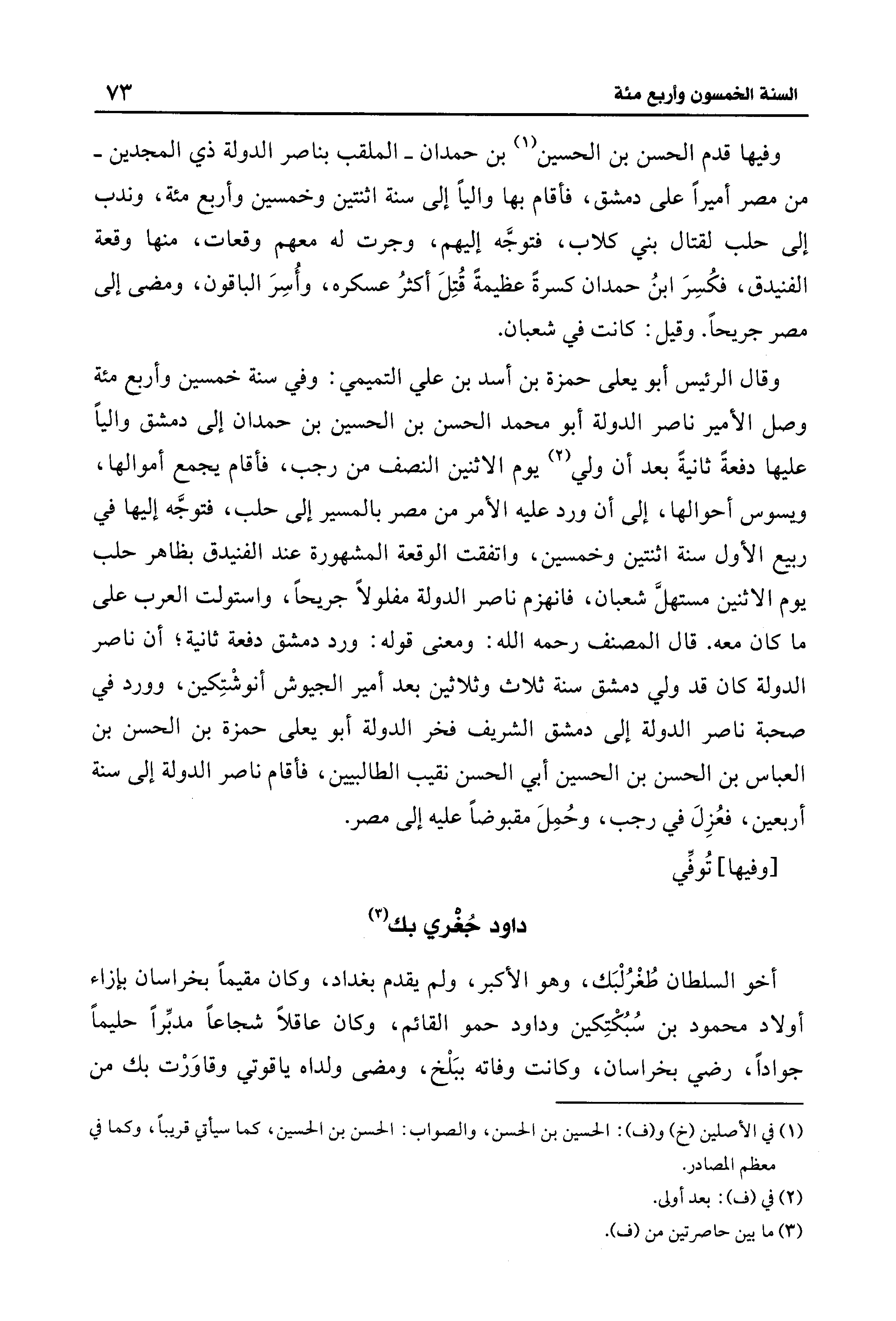 وفيها قدم الحسن بن الحسين (¬1) بن حمدان -الملقب بناصر الدولة ذي المجدين- من مصر أميرًا على دمشق، فأقام بها واليًا إلى سنة اثنتين وخمسين وأربع مئة، وندب إلى حلب لقتال بني كلاب، فتوجَّه إليهم، وجرت له معهم وقعات، منها وقعة الفنيدق، فكُسِرَ ابنُ حمدان كسرةً عظيمةً قُتِلَ أكثرُ عسكره، وأُسِرَ الباقون، ومضى إلى مصر جريحًا. وقيل: كانت في شعبان.