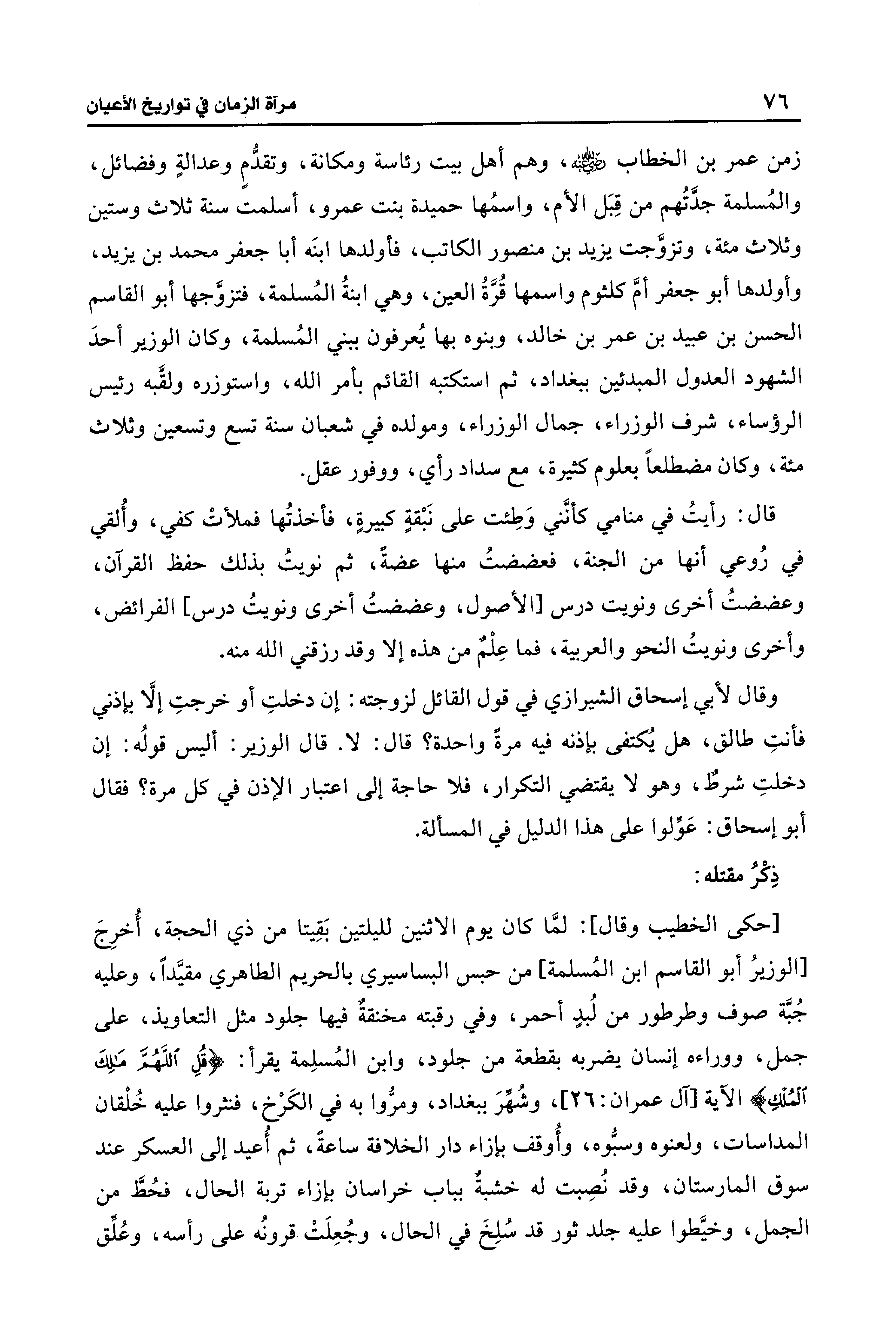 زمن عمر بن الخطاب رضي الله عنه، وهم أهل بيت رئاسة ومكانة، وتقدُّمٍ وعدالةٍ وفضائل، والمُسلمة جدَّتُهم من قِبَل الأم، واسمُها حميدة بنت عمرو، أسلمت سنة ثلاث وستين وثلاث مئة، وتزوَّجت يزيد بن منصور الكاتب، فأولدها ابنَه أبا جعفر محمد بن يزيد، وأولدها أبو جعفر أمَّ كلثوم واسمها قُرَّةُ العين، وهي ابنةُ المُسلمة، فتزوَّجها أبو القاسم الحسن بن عبيد بن عمر بن خالد، وبنوه بها يُعرفون ببني المُسلمة، وكان الوزير أحدَ الشهود العدول المبدئين ببغداد، ثم استكتبه القائم بأمر الله، واستوزره ولقَّبه رئيس الرؤساء، شرف الوزراء، جمال الوزراء، ومولده في شعبان سنة تسع وتسعين وثلاث مئة، وكان مضطلعًا بعلوم كثيرة، مع سداد رأي، ووفور عقل. قال: رأيتُ في منامي كأنَّني وَطِئت على نَبْقةٍ كبيرةٍ، فأخذتُها فملأتْ كفي، وأُلقي في رُوعي أنها من الجنة، فعضضتُ منها عضةً، ثم نويتُ بذلك حفظ القرآن، وعضضتُ أخرى ونويت درس [الأصول، وعضضتُ أخرى ونويتُ درس] الفرائض، وأخرى ونويتُ النحو والعربية، فما عِلْمٌ من هذه إلا وقد رزقني الله منه.