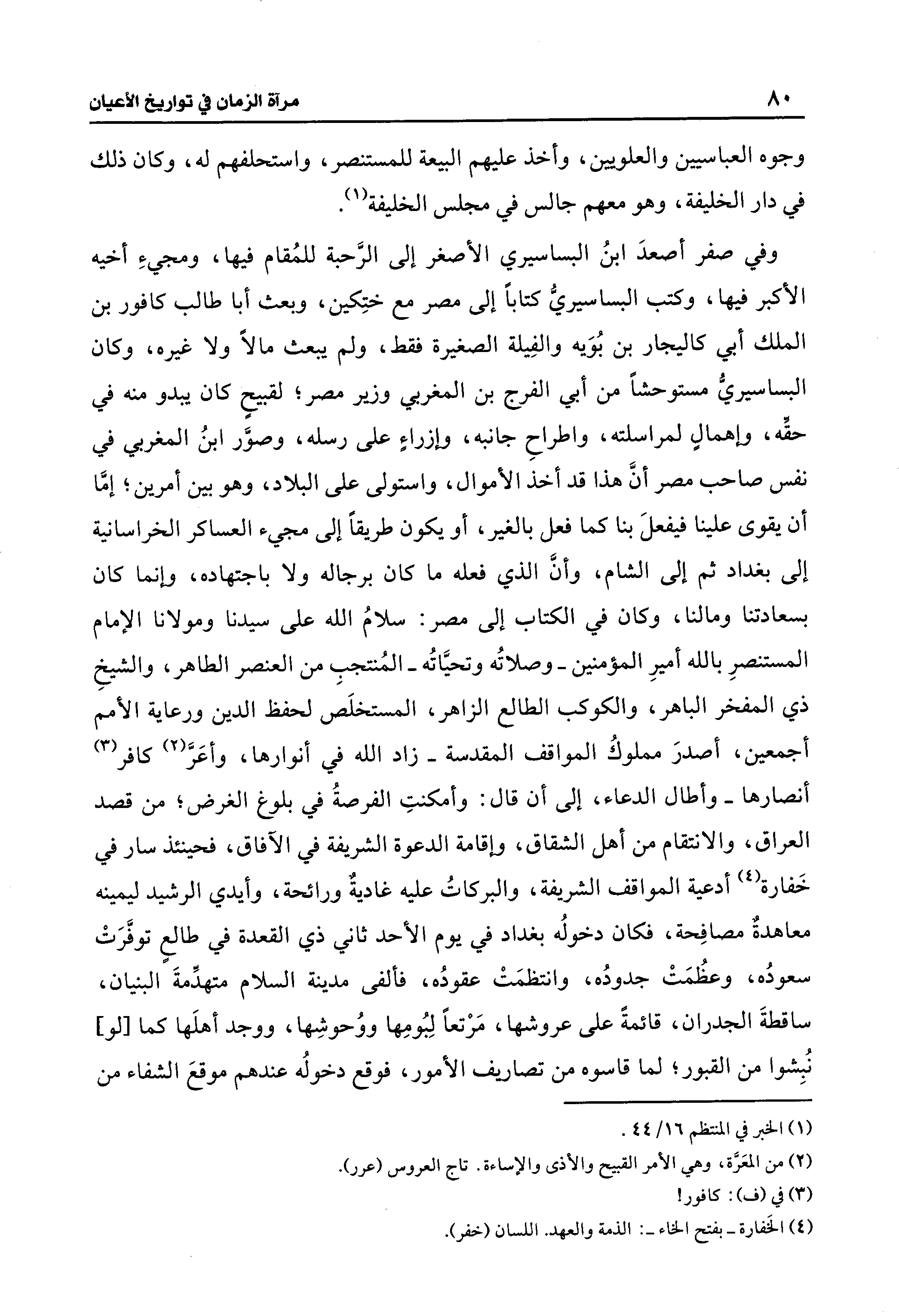 وفي صفر أصعدَ ابنُ البساسيري الأصغر إلى الرَّحبة للمُقام فيها، ومجيءِ أخيه الأكبر فيها، وكتب البساسيريُّ كتابًا إلى مصر مع ختِكين، وبعث أبا طالب كافور بن الملك أبي كاليجار بن بُوَيه والفِيلة الصغيرة فقط، ولم يبعث مالًا ولا غيره، وكان البساسيريُّ مستوحشًا من أبي الفرج بن المغربي وزير مصر؛ لقبيحٍ كان يبدو منه في حقِّه، وإهمالٍ لمراسلته، واطراحِ جانبه، وإزراءٍ على رسله، وصوَّر ابنُ المغربي في نفس صاحب مصر أنَّ هذا قد أخذ الأموال، واستولى على البلاد، وهو بين أمرين؛ إمّا أن يقوى علينا فيفعلَ بنا كما فعل بالغير، أو يكون طريقًا إلى مجيء العساكر الخراسانية إلى بغداد ثم إلى الشام، وأنَّ الذي فعله ما كان برجاله ولا باجتهاده، وإنما كان بسعادتنا ومالنا، وكان في الكتاب إلى مصر: سلامُ الله على سيدنا ومولانا الإمام المستنصرِ بالله أميرِ المؤمنين -وصلاتُه وتحيّاتُه- المُنتجبِ من العنصر الطاهر، والشيخِ ذي المفخر الباهر، والكوكب الطالع الزاهر، المستخلَص لحفظ الدين ورعاية الأمم أجمعين، أصدرَ مملوكُ المواقف المقدسة- زاد الله في أنوارها، وأعَرَّ (¬2) كافر (¬3) أنصارها -وأطال الدعاء، إلى أن قال: وأمكنتِ الفرصةُ في بلوغ الغرض؛ من قصد العراق، والانتقام من أهل الشقاق، وإقامة الدعوة الشريفة في الآفاق، فحينئذ سار في خَفارة (¬4) أدعية المواقف الشريفة، والبركاتُ عليه غادية ورائحة، وأيدي الرشيد ليمينه معاهدةٌ مصافِحة، فكان دخولُه بغداد في يوم الأحد ثاني ذي القعدة في طالعٍ توفَّرَتْ سعودُه، وعظُمَتْ جدودُه، وانتظمَتْ عقودُه، فألفى مدينة السلام متهدِّمةَ البنيان، ساقطةَ الجدران، قائمة على عروشها، مَرْتعا لِبُومِها ووُحوشِها، ووجد أهلَها كما [لو] نُبِشوا من القبور؛ لما قاسوه من تصاريف الأمور، فوقع دخولُه عندهم موقعَ الشفاء من
