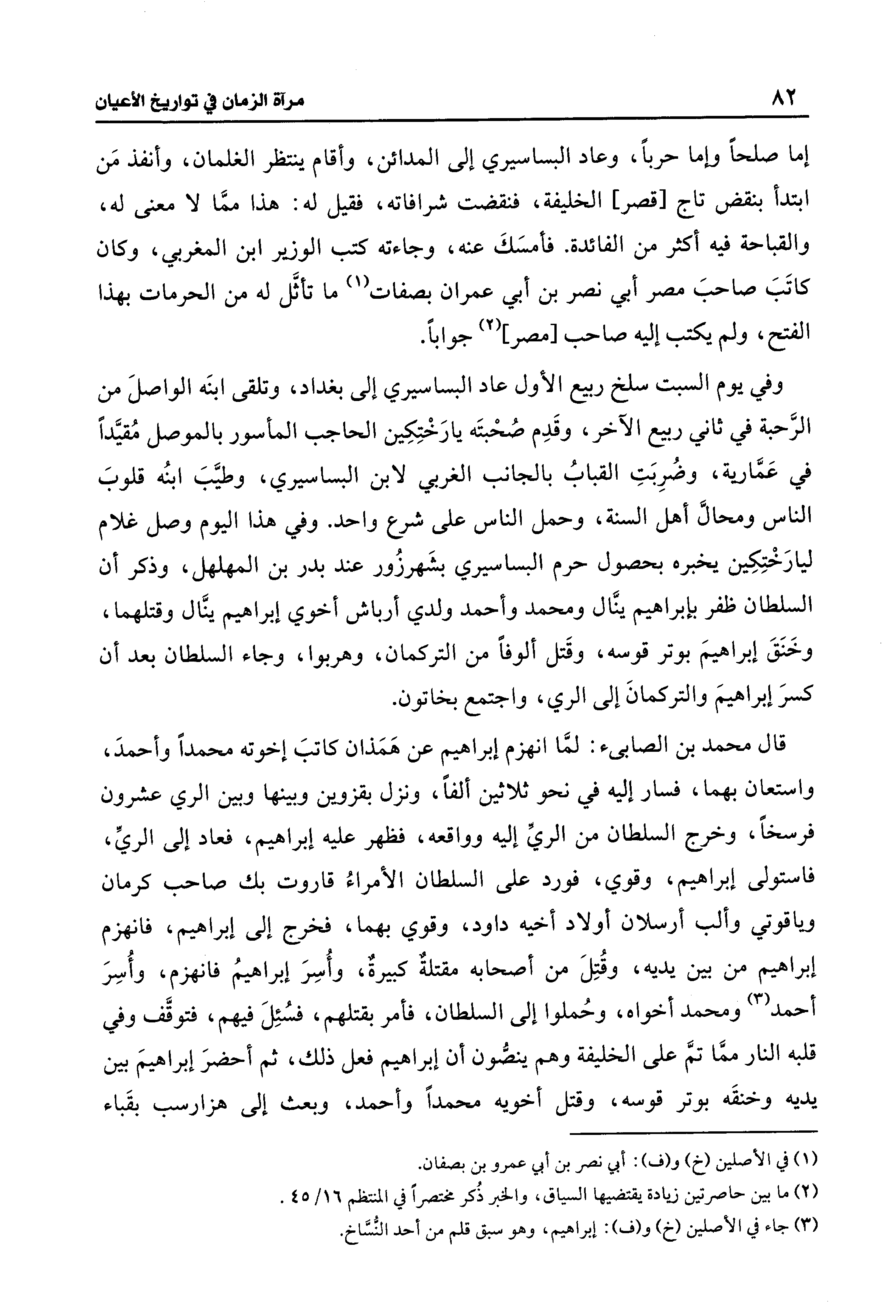 إما صلحًا وإما حربًا، وعاد البساسيري إلى المدائن، وأقام ينتظر الغلمان، وأنفذ مَن ابتدأ بنقض تاج [قصر] الخليفة، فنقضت شرافاته، فقيل له: هذا ممَّا لا معنى له، والقباحة فيه أكثر من الفائدة. فأمسَكَ عنه، وجاءته كتب الوزير ابن المغربي، وكان كاتَبَ صاحبَ مصر أبي نصر بن أبي عمران بصفات (¬1) ما تأثَّل له من الحرمات بهذا الفتح، ولم يكتب إليه صاحب [مصر] (¬2) جوابًا.