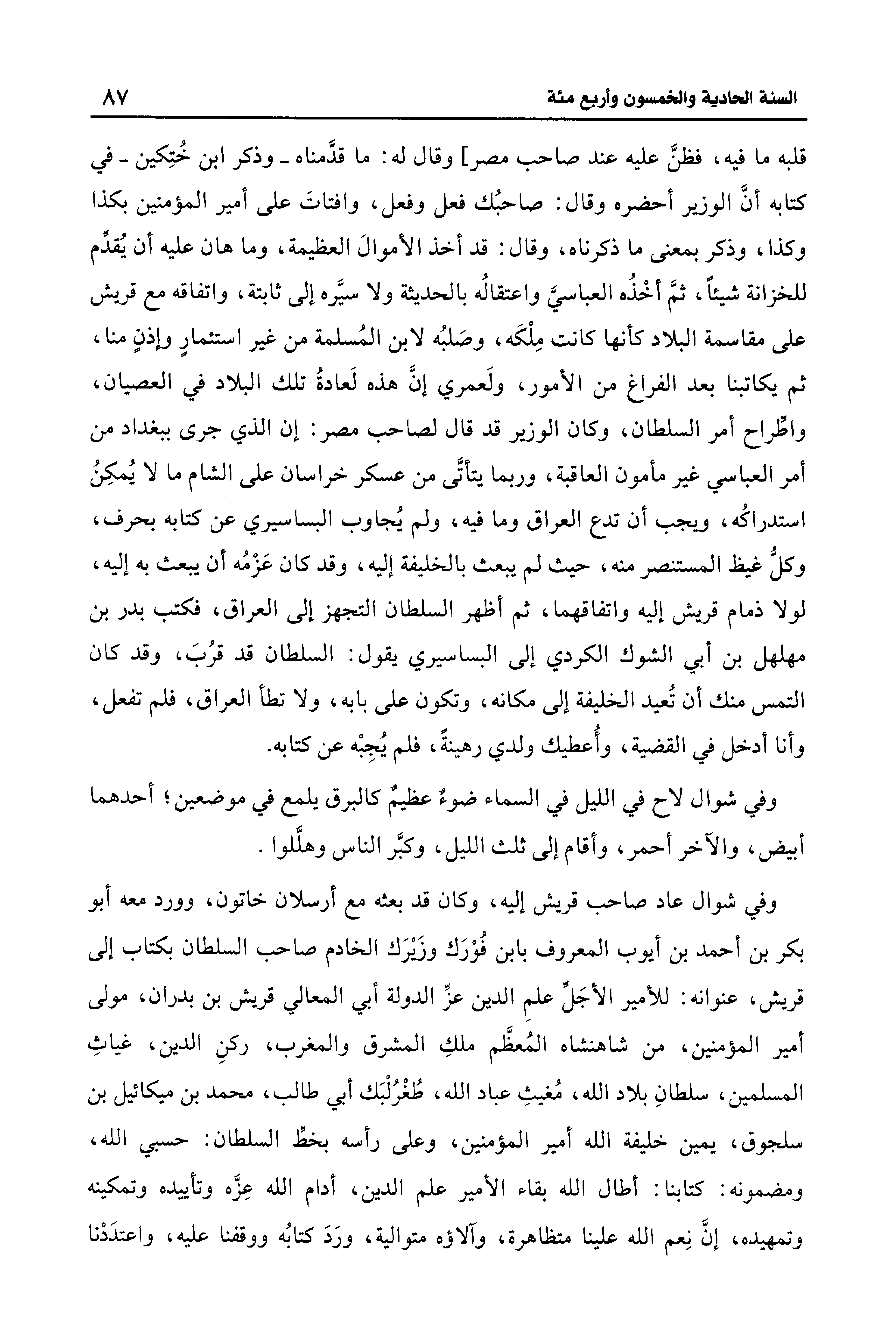 قلبه ما فيه، فظنَّ عليه عند صاحب مصر] وقال له: ما قدَّمناه -وذكر ابن خُتِكين- في كتابه أنَّ الوزير أحضره وقال: صاحبُك فعل وفعل، وافتاتَ على أمير المؤمنين بكذا وكذا، وذكر بمعنى ما ذكرناه، وقال: قد أخذ الأموال العظيمة، وما هان عليه أن يُقدِّم للخزانة شيئًا، ثمَّ أخْذُه العباسيَّ واعتقالُه بالحديثة ولا سيَّره إلى ثابتة، واتفاقه مع قريش على مقاسمة البلاد كأنها كانت مِلْكَه، وصَلبُه لابن المُسلمة من غير استئمارٍ وإذنٍ منا، ثمَّ يكاتبنا بعد الفراغ من الأمور، ولَعمري إنَّ هذه لَعادةُ تلك البلاد في العصيان، واطِّراح أمر السلطان، وكان الوزير قد قال لصاحب مصر: إن الذي جرى ببغداد من أمر العباسي غير مأمون العاقبة، وربما يتأتَّى من عسكر خراسان على الشام ما لا يُمكِنُ استدراكُه، ويجب أن تدع العراق وما فيه، ولم يُجاوب البساسيري عن كتابه بحرف، وكلُّ غيظ المستنصر منه، حيث لم يبعث بالخليفة إليه، وقد كان عَزْمُه أن يبعث به إليه، لولا ذمام قريش إليه واتفاقهما، ثم أظهر السلطان التجهز إلى العراق، فكتب بدر بن مهلهل بن أبي الشوك الكردي إلى البساسيري يقول: السلطان قد قرُبَ، وقد كان التمس منك أن تُعيد الخليفة إلى مكانه، وتكون على بابه، ولا تطأ العراق، فلم تفعل، وأنا أدخل في القضية، وأُعطيك ولدي رهينةً، فلم يُجِبْه عن كتابه.