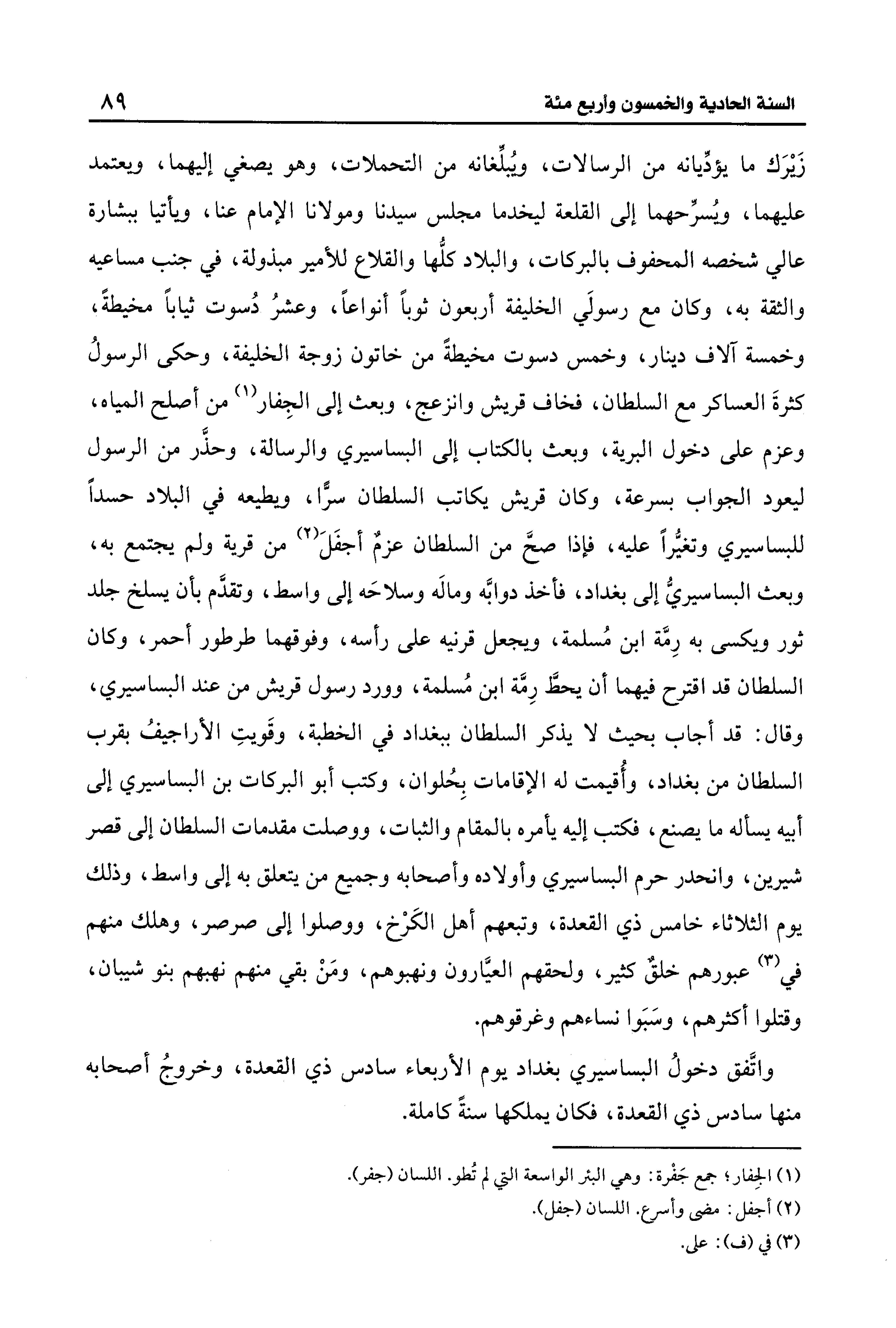 واتَّفق دخولُ البساسيري بغداد يوم الأربعاء سادس ذي القعدة، وخروجُ أصحابه منها سادس ذي القعدة، فكان يملكها سنةً كاملة.