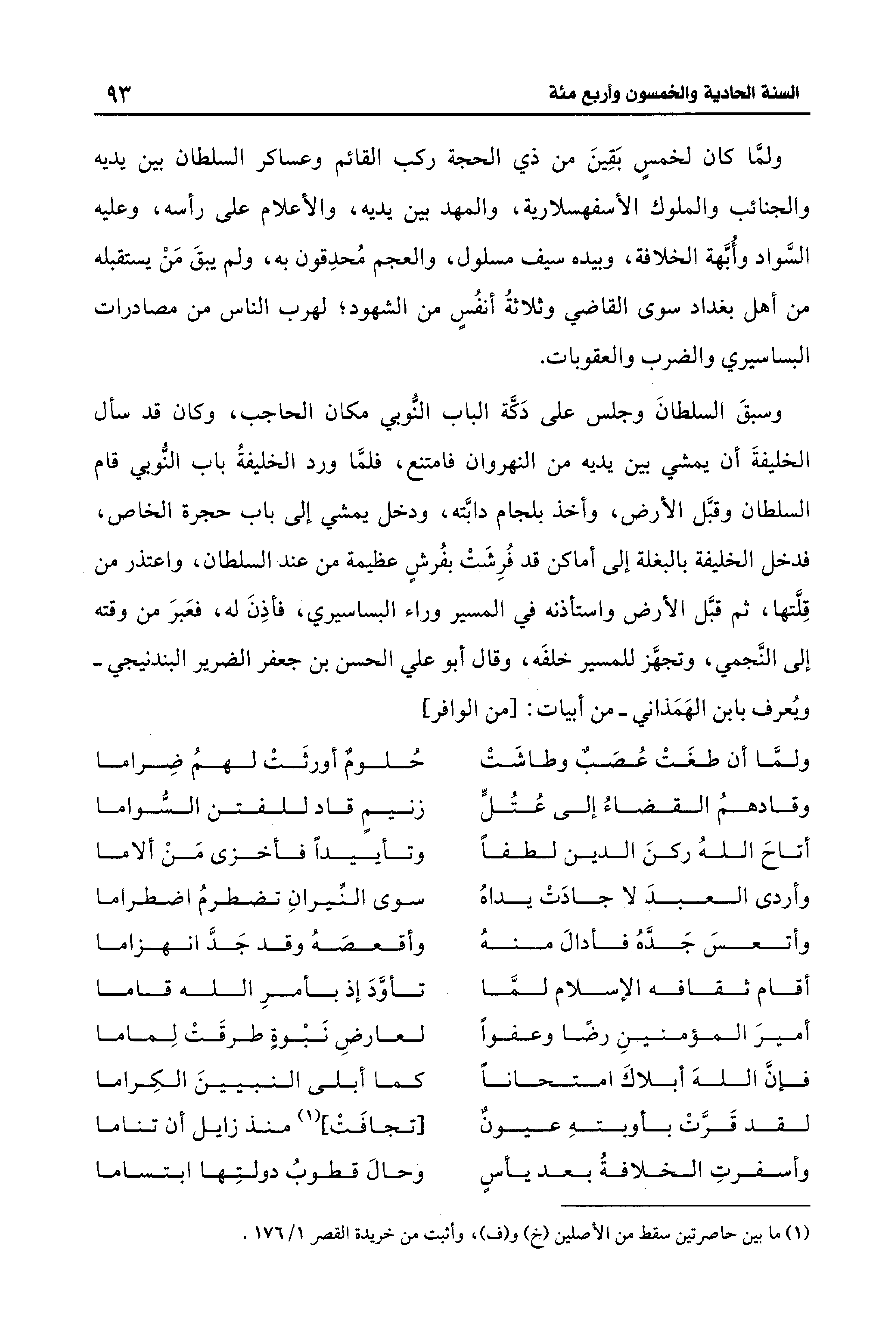 وسبقَ السلطانَ وجلس على دَكَّة الباب النُّوبي مكان الحاجب، وكان قد سأل الخليفةَ أن يمشي بين يديه من النهروان فامتنع، فلمّا ورد الخليفةُ باب النُّوبي قام السلطان وقبَّل الأرض، وأخذ بلجام دابَّته، ودخل يمشي إلى باب حجرة الخاص، فدخل الخليفة بالبغلة إلى أماكن قد فُرِشَتْ بفُرشٍ عظيمة من عند السلطان، واعتذر من قِلَّتها، ثمَّ قبَّل الأرض واستأذنه في المسير وراء البساسيري، فأذِنَ له، فعَبرَ من وقته إلى النَّجمي، وتجهَّز للمسير خلفَه، وقال أبو علي الحسن بن جعفر الضرير البندنيجي -ويعرف بابن الهَمَذاني- من أبيات: [من الوافر]