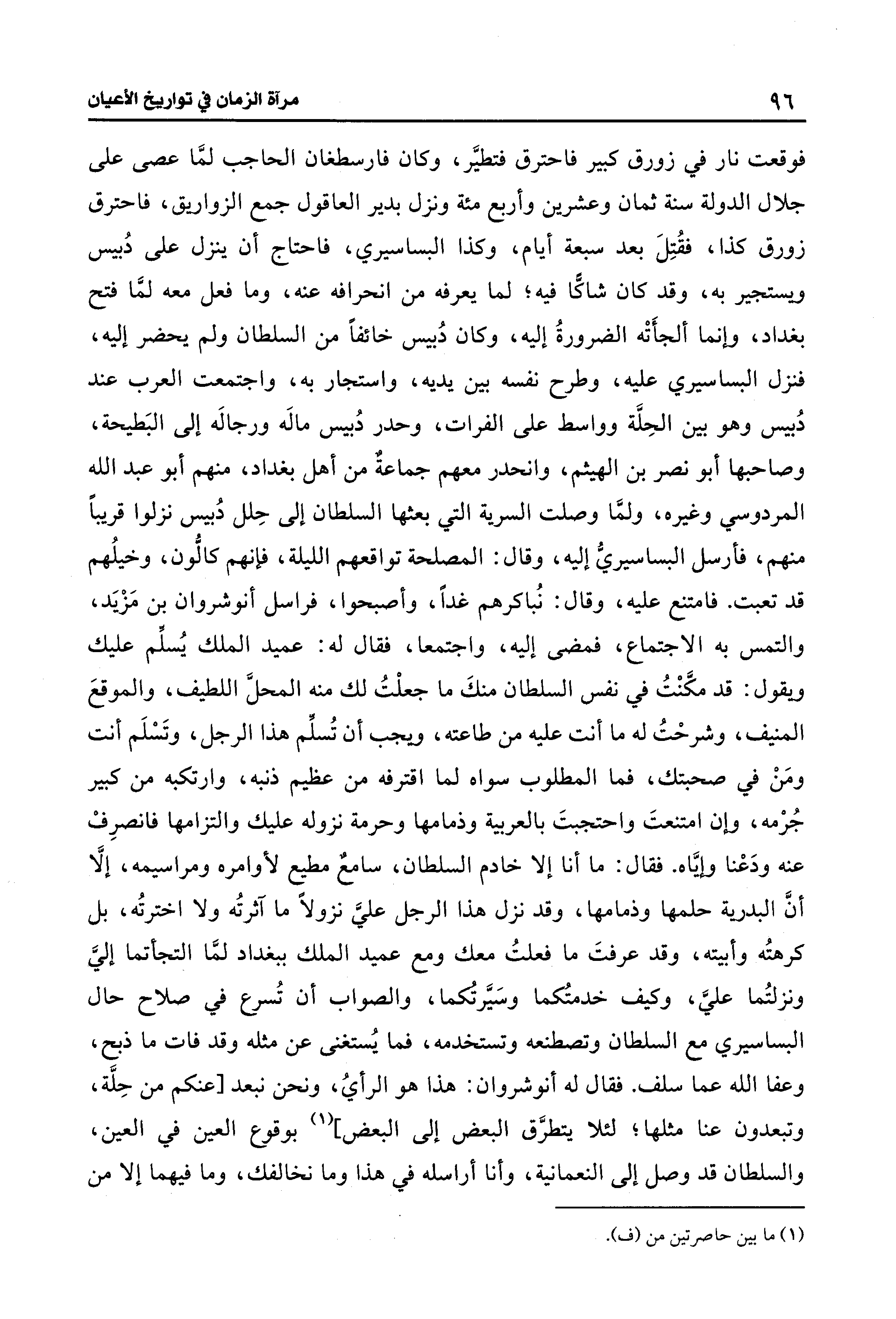فوقعت نار في زورق كبير فاحترق فتطيَّر، وكان فارسطغان الحاجب لمّا عصى على جلال الدولة سنة ثمان وعشرين وأربع مئة ونزل بدير العاقول جمع الزواريق، فاحترق زورق كذا، فقُتِلَ بعد سبعة أيام، وكذا البساسيري، فاحتاج أن ينزل على دُبيس ويستجير به، وقد كان شاكًّا فيه؛ لما يعرفه من انحرافه عنه، وما فعل معه لمّا فتح بغداد، وإنما ألجأَتْه الضرورةُ إليه، وكان دُبيس خائفًا من السلطان ولم يحضر إليه، فنزل البساسيري عليه، وطرح نفسه بين يديه، واستجار به، واجتمعت العرب عند دُبيس وهو بين الحلَّة وواسط على الفرات، وحدر دُبيس ماله ورجاله إلى البَطيحة، وصاحبها أبو نصر بن الهيثم، وانحدر معهم جماعةٌ من أهل بغداد، منهم أبو عبد الله المردوسي وغيره، ولمّا وصلت السرية التي بعثها السلطان إلى حِلل دُبيس نزلوا قريبًا منهم، فأرسل البساسيريُّ إليه، وقال: المصلحة تواقعهم الليلة، فإنهم كالُّون، وخيلُهم قد تعبت. فامتنع عليه، وقال: نُباكرهم غدًا، وأصبحوا، فراسل أنوشروان بن مَزْيَد، والتمس به الاجتماع، فمضى إليه، واجتمعا، فقال له: عميد الملك يُسلِّم عليك ويقول: قد مكَّنْتُ في نفس السلطان منكَ ما جعلْتُ لك منه المحلَّ اللطيف، والموقعَ المنيف، وشرحْتُ له ما أنت عليه من طاعته، ويجب أن تُسلِّم هذا الرجل، وتَسْلَم أنت ومَنْ في صحبتك، فما المطلوب سواه لما اقترفه من عظيم ذنبه، وارتكبه من كبير جُرْمه، وإن امتنعتَ واحتجبتَ بالعربية وذمامها وحرمة نزوله عليك والتزامها فانصرِفْ عنه ودَعْنا وإيّاه. فقال: ما أنا إلا خادم السلطان، سامعٌ مطيع لأوامره ومراسيمه، إلَّا أنَّ البدرية حلمها وذمامها، وقد نزل هذا الرجل عليَّ نزولًا ما آثرتُه ولا اخترتُه، بل كرهتُه وأبيته، وقد عرفتَ ما فعلتُ معك ومع عميد الملك ببغداد لمّا التجأتما إليَّ ونزلتُما عليَّ، وكيف خدمتكما وسَيَّرتكما، والصواب أن تُسرع في صلاح حال البساسيري مع السلطان وتصطنعه وتستخدمه، فما يُستغنى عن مثله وقد فات ما ذبح، وعفا الله عما سلف. فقال له أنوشروان: هذا هو الرأيُ، ونحن نبعد [عنكم من حِلَّة، وتبعدون عنا مثلها؛ لئلا يتطرَّق البعض إلى البعض] (¬1) بوقوع العين في العين، والسلطان قد وصل إلى النعمانية، وأنا أراسله في هذا وما نخالفك، وما فيهما إلا من