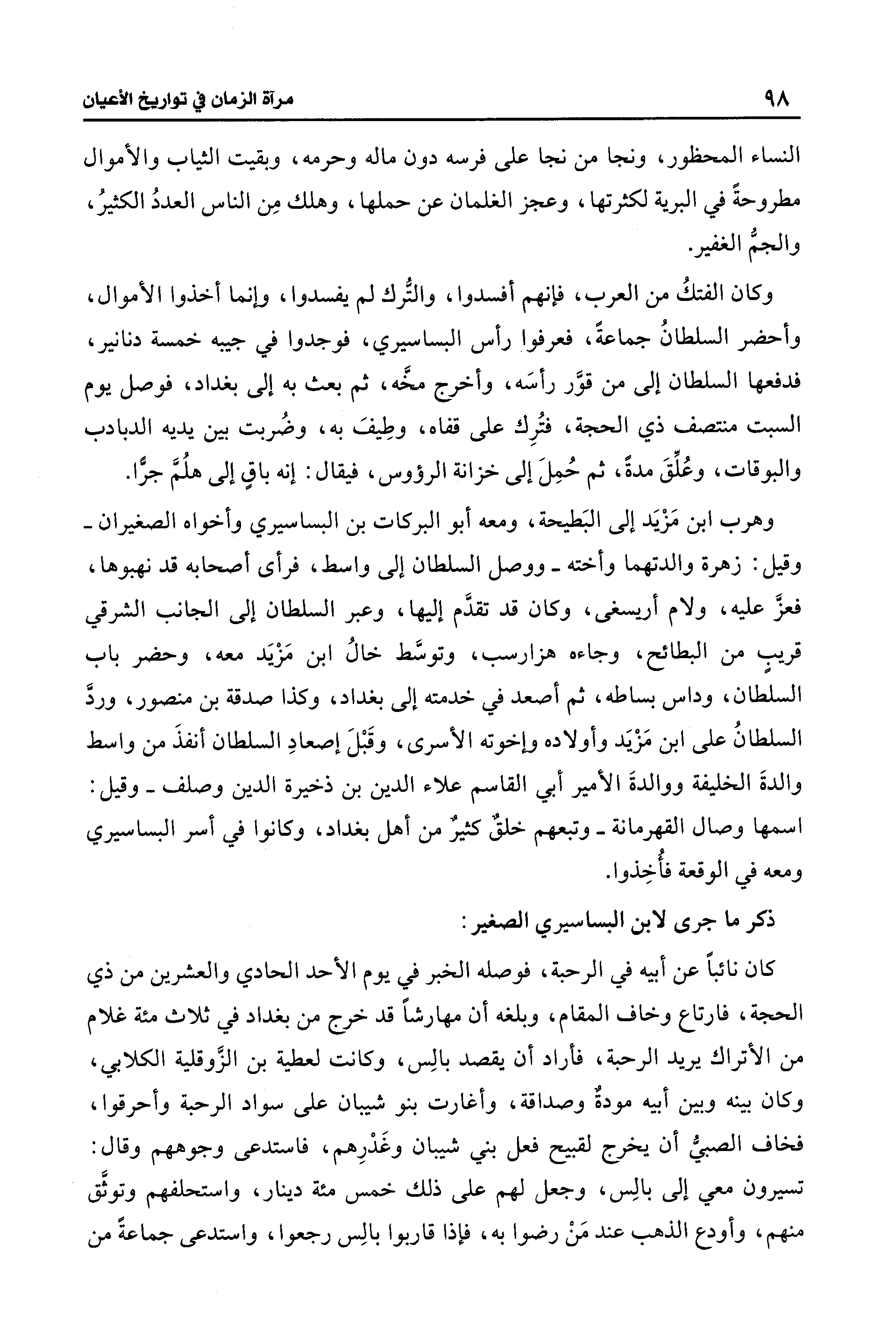 وكان الفتكُ من العرب، فإنهم أفسدوا، والتُّرك لم يفسدوا، وإنما أخذوا الأموال، وأحضر السلطانُ جماعةً، فعرفوا رأس البساسيري، فوجدوا في جيبه خمسة دنانير، فدفعها السلطان إلى من قوَّر رأسَه، وأخرج مخَّه، ثمَّ بعث به إلى بغداد، فوصل يوم السبت منتصف ذي الحجة، فتُرِك على قفاه، وطِيفَ به، وضُربت بين يديه الدبادب والبوقات، وعُلِّقَ مدةً، ثمَّ حُمِلَ إلى خزانة الرؤوس، فيقال: إنه باقٍ إلى هلُمَّ جرًّا.