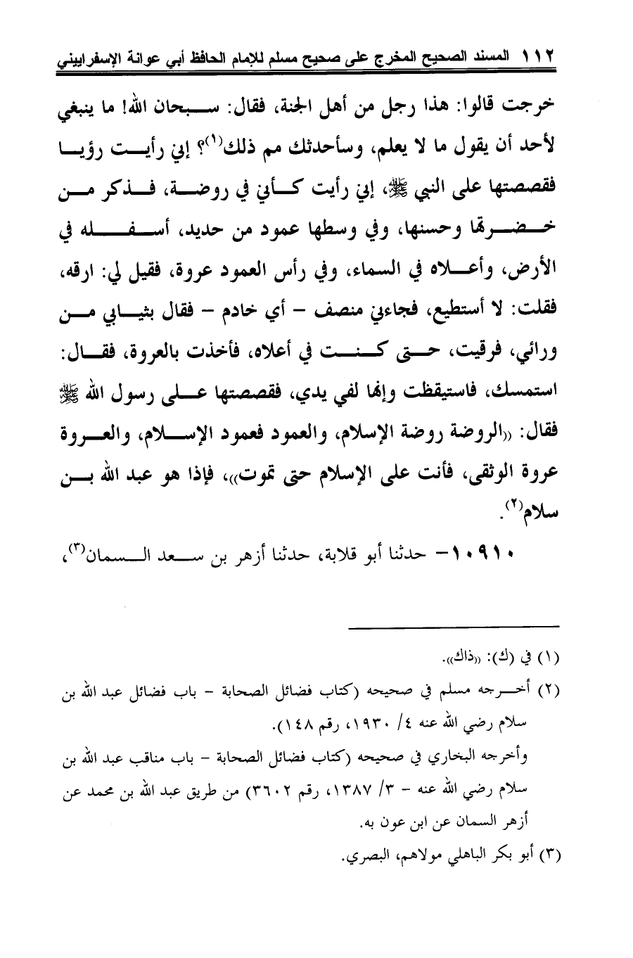 قال أزهر في حديثه: فجمعت ثيابي من خلفي فرقيت، حتى كنت في أعلاه، فأخذت بالعروة، فقال: استمسك! فاستيقظت وإنها لفي يدي، فقصصتها على رسول الله -صلى الله عليه وسلم-، فقال: "الروضة روضة الإسلام، وأما العمود فعمود الإسلام، والعروة فعروة الوثقى (¬3) فأنت على الإسلام حتى تموت، والرجل هو: عبد الله بن سلام" (¬4).