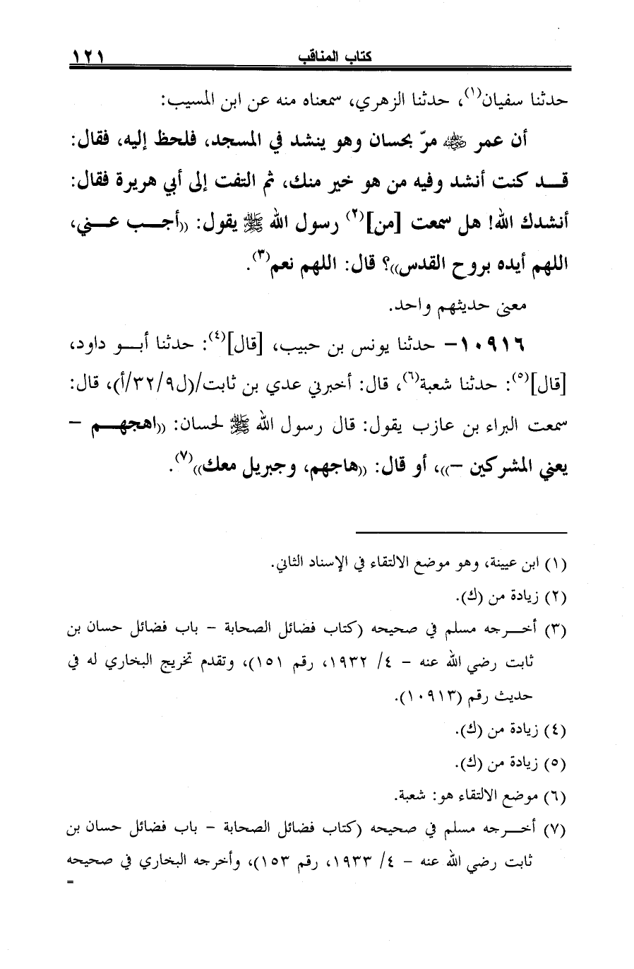 (¬4) أخرجه مسلم في صحيحه (كتاب فضائل الصحابة -باب فضائل حسان بن ثابت رضي الله عنه-4/ 1933، رقم 153)، وأخرجه البخاري في صحيحه =