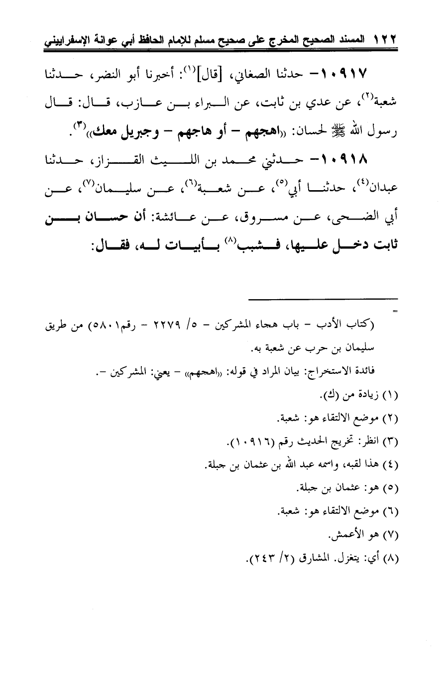 10917 - حدثنا الصغاني، [قال] (¬1): أخبرنا أبو النضر، حدثنا شعبة (¬2)، عن عدي بن ثابت، عن البراء بن عازب، قال: قال رسول الله -صلى الله عليه وسلم- لحسان: "اهجهم -أو هاجهم- وجبريل معك" (¬3).