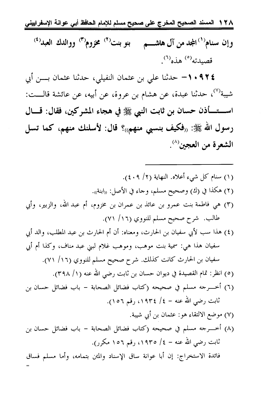 10924 - حدثنا علي بن عثمان النفيلي، حدثنا عثمان بن أبي شيبة (¬1)، حدثنا عبدة، عن هشام بن عروة، عن أبيه، عن عائشة قالت: استأذن حسان بن ثابت النّبيّ -صلى الله عليه وسلم- في هجاء المشركين، فقال: قال رسول الله -صلى الله عليه وسلم-: "فكيف بنسبي منهم"؟ قال: لأسلنك منهم، كما تسل الشعرة من العجين (¬2).