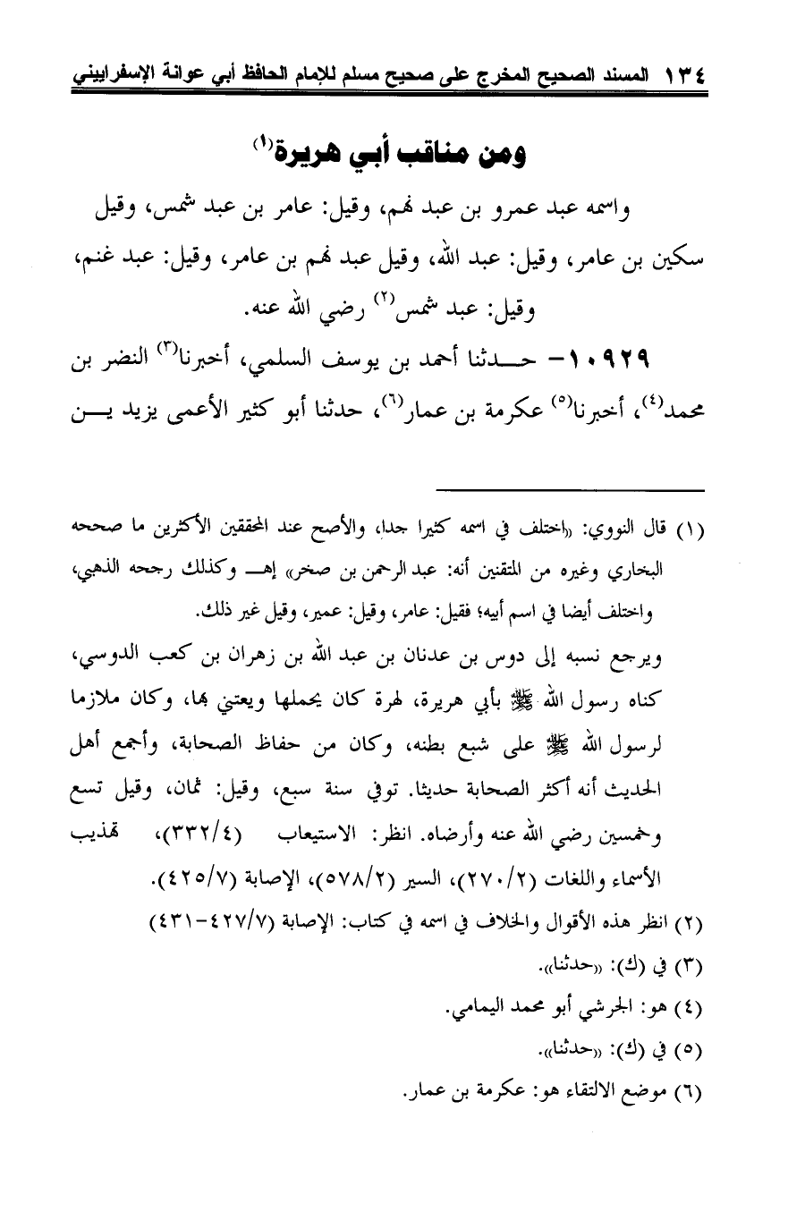 (¬1) قال النووي: "اختلف في اسمه كثيرًا جدًّا، والأصح عند المحققين الأكثرين ما صححه البخاري وغيره من المتقنين أنه: عبد الرحمن بن صخر" اهـ وكذلك رجحه الذهبي، واختلف أيضًا في اسم أبيه؛ فقيل: عامر، وقيل: عمير، وقيل غير ذلك.