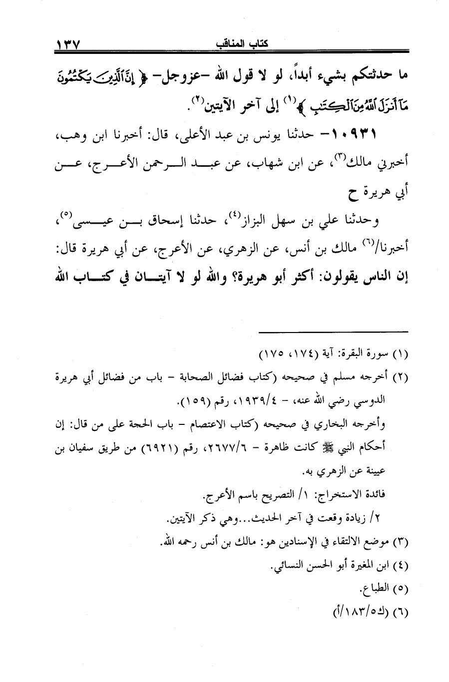 وحدثنا علي بن سهل البزاز (¬2)، حدثنا إسحاق بن عيسى (¬3)، أخبرنا (¬4) مالك بن أنس، عن الزهري، عن الأعرج، عن أبي هريرة قال: إن الناس يقولون: أكثر أبو هريرة؟ والله لولا آيتان في كتاب الله