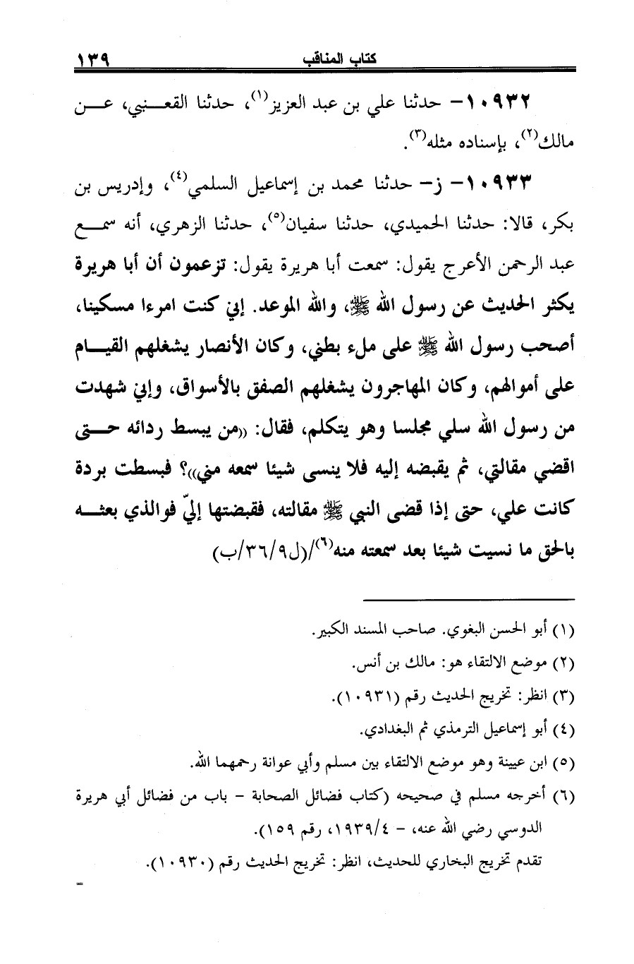 10933 - ز- حدثنا محمد بن إسماعيل السلمي (¬1)، وإدريس بن بكر، قالا: حدثنا الحميدي، حدثنا سفيان (¬2)، حدثنا الزهري، أنه سمع عبد الرحمن الأعرج يقول: سمعت أبا هريرة يقول: تزعمون أن أبا هريرة يكثر الحديث عن رسول الله -صلى الله عليه وسلم-، والله الموعد. إلَيَّ كنت امرءا مسكينا، أصحب رسول الله -صلى الله عليه وسلم- على ملء بطني، وكان الأنصار يشغلهم القيام على أموالهم، وكان المهاجرون يشغلهم الصفق بالأسواق، وإني شهدت من رسول الله سلي مجلسا وهو يتكلم، فقال: "من يبسط ردائه حتى اقضي مقالتي، ثم يقبضه إليه فلا ينسى شيئًا سمعه مني"؟ فبسطت بردة كانت علي، حتى إذا قضى النبيّ -صلى الله عليه وسلم- مقالته، فقبضتها إليّ فوالذي بعثه بالحق ما نسيت شيئًا بعد سمعته منه (¬3).