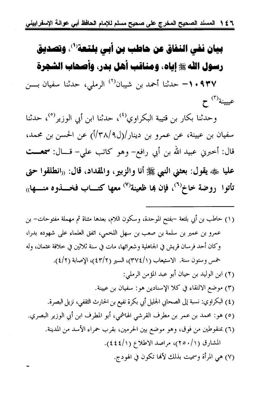 (¬12) أخرجه مسلم في صحيحه (كتاب فضائل الصحابة -باب من فضائل أهل بدر رضي الله عنهم، وقصة حاطب بن أبي بلتعة-4/ 1941، رقم (161)، وأخرج البخاري في صحيحه (كتاب الجهاد -باب الجاسوس-3/ 1095، رقم 2845) من طريق علي بن المديني عن سفيان بن عيينة به.