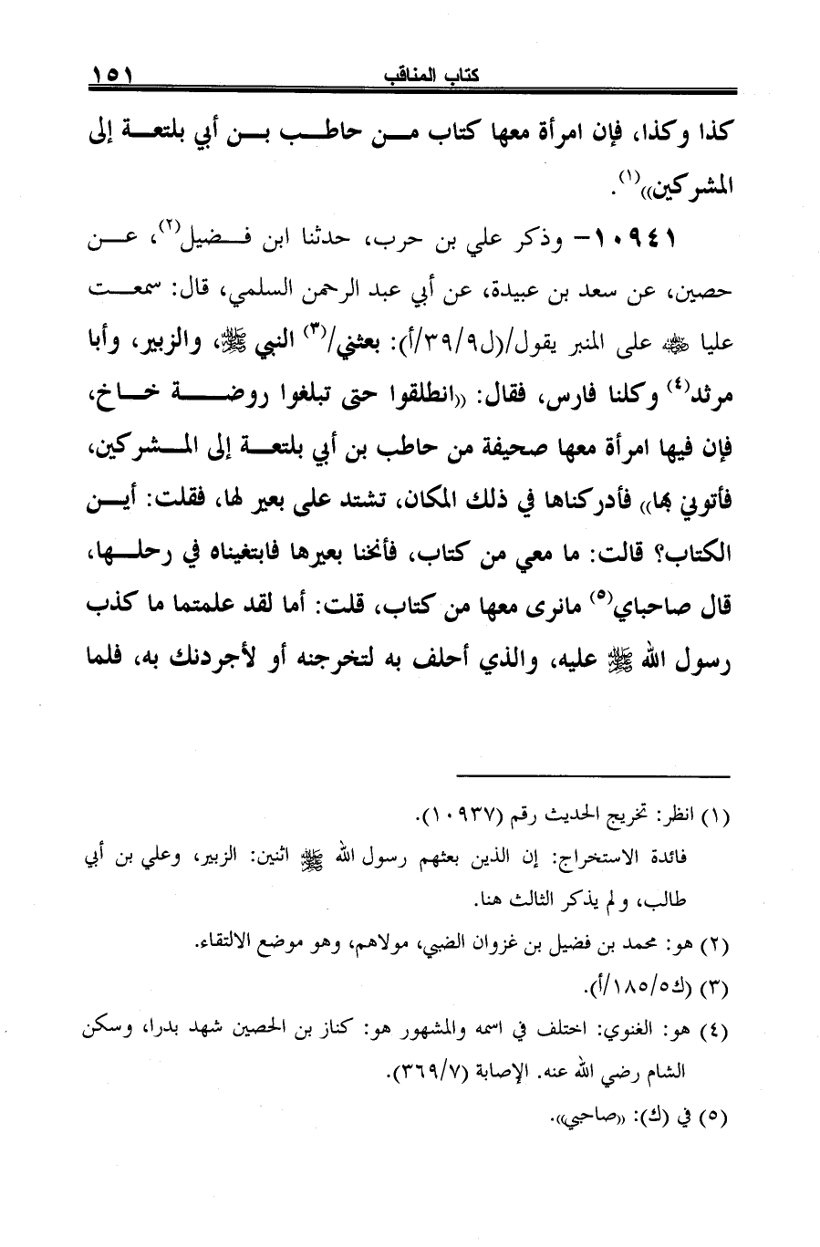 10941 - وذكر علي بن حرب، حدثنا ابن فضيل (¬1)، عن حصين، عن سعد بن عبيدة، عن أبي عبد الرحمن السلمي، قال: سمعت عليا -رضي الله عنه- على المنبر يقول: بعثني (¬2) النَّبيّ -صلى الله عليه وسلم-، والزبير، وأبا مرثد (¬3) وكلنا فارس، فقال: "انطلقوا حتى تبلغوا روضة خاخ، فإن فيها امرأة معها صحيفة من حاطب بن أبي بلتعة إلى المشركين، فأتوني بها" فأدركناها في ذلك المكان، تشتد على بعير لها، فقلت: أين الكتاب؟ قالت: ما معي من كتاب، فأنخنا بعيرها فابتغيناه في رحلها، قال صاحباي (¬4) مانرى معها من كتاب، قلت: أما لقد علمتما ما كذب رسول الله -صلى الله عليه وسلم- عليه، والذي أحلف به لتخرجنه أو لأجردنك به، فلما