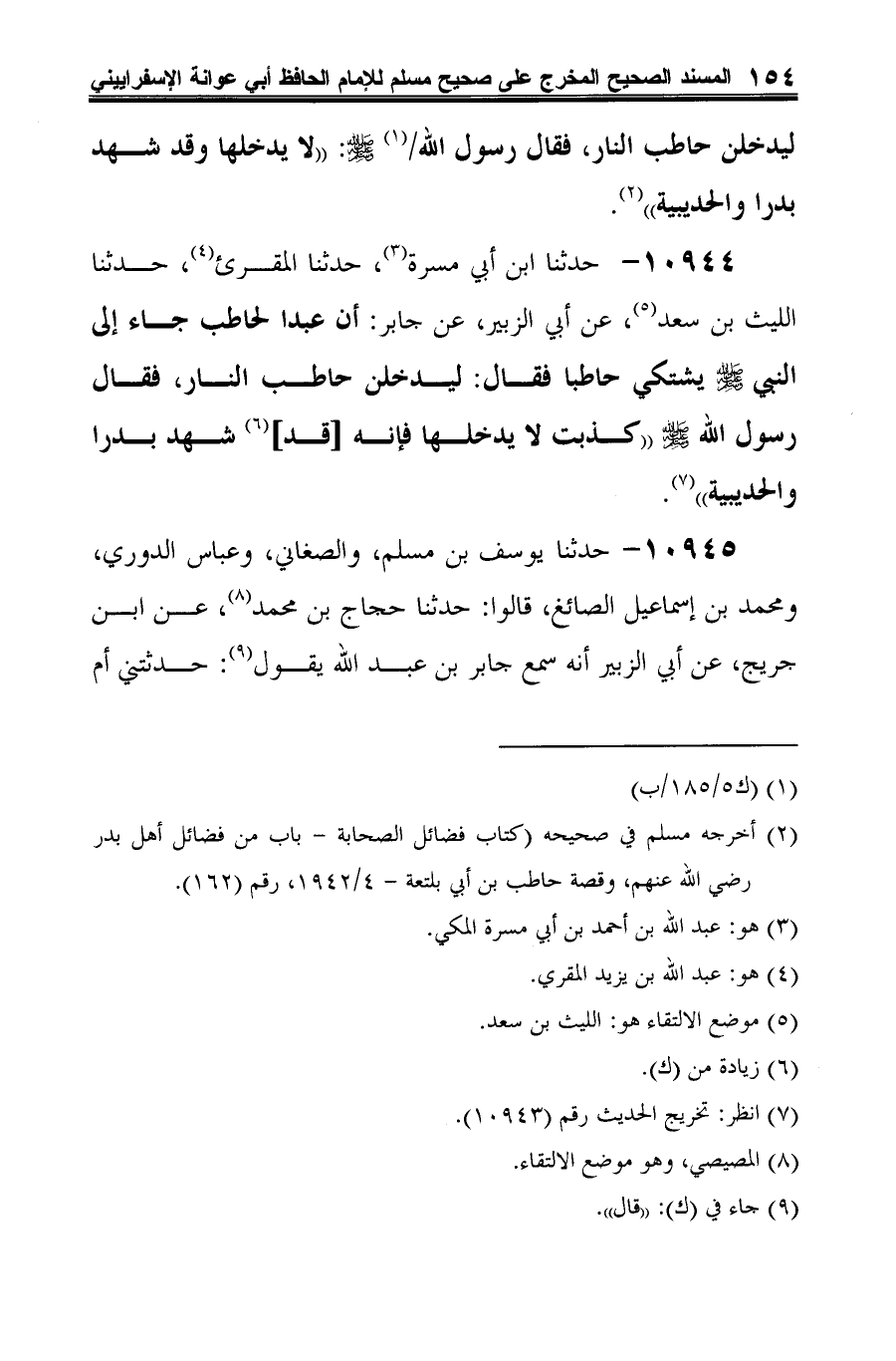 10944 - حدثنا ابن أبي مسرة (¬1)، حدثنا المقرئ (¬2)، حدثنا الليث بن سعد (¬3)، عن أبي الزبير، عن جابر: أن عبدًا لحاطب جاء إلى النَّبيّ -صلى الله عليه وسلم- يشتكي حاطبًا فقال: ليدخلن حاطب النار، فقال رسول الله -صلى الله عليه وسلم- "كذبت لا يدخلها فإنه [قد] (¬4) شهد بدرًا والحديبية" (¬5).