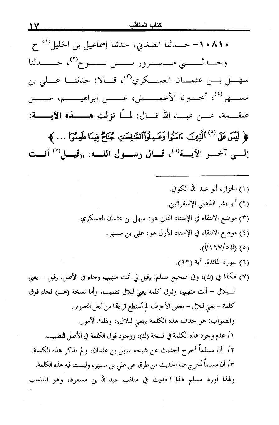 10810 - حدثنا الصغاني، حدثنا إسماعيل بن الخليل (¬1) ح