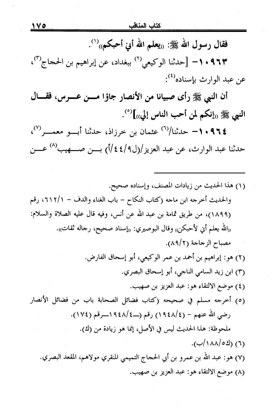 -[176]- أنس بن مالك: أن النبي -صلى الله عليه وسلم- رأى صبيانا و (¬4) نساءا مقبلين -أحسبه قال: - من عرس، فقام نبي الله -صلى الله عليه وسلم- مقبلا، فقال: "اللهم أنتم أحب الناس إليّ" قالها ثلاثًا -يعني الأنصار- (¬5).