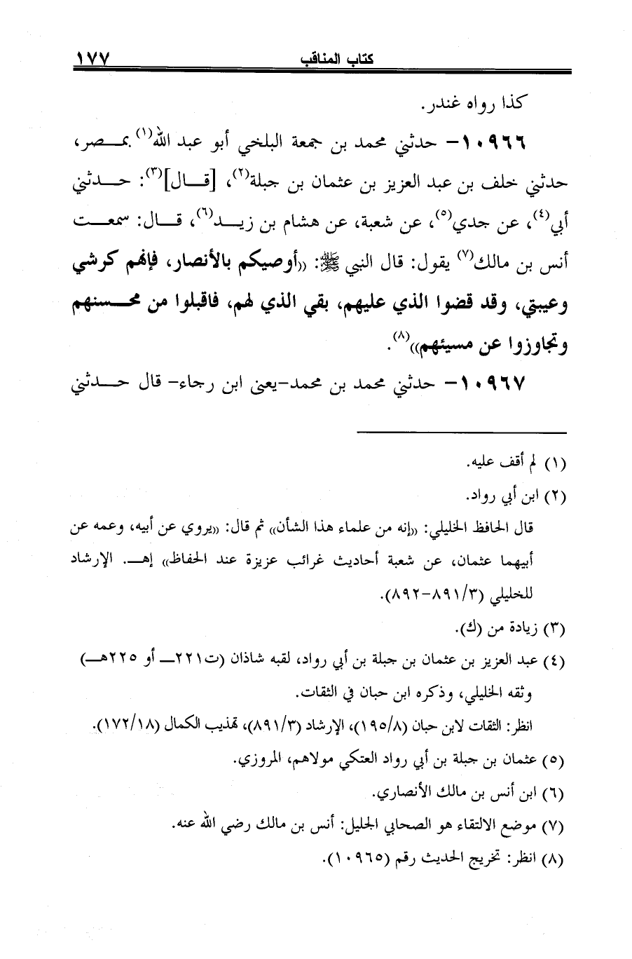 10966 - حدثني محمَّد بن جمعة البلخي أبو عبد الله (¬1). بمصر، حدثني خلف بن عبد العزيز بن عثمان بن جبلة (¬2)، [قال] (¬3): حدثني أبي (¬4)، عن جدي (¬5)، عن شعبة، عن هشام بن زيد (¬6)، قال: سمعت أنس بن مالك (¬7) يقول: قال النبي -صلى الله عليه وسلم-: "أوصيكم بالأنصار، فإنهم كرشي وعيبتي، وقد قضوا الذي عليهم، بقي الذي لهم، فاقبلوا من محسنهم وتجاوزوا عن مسيئهم" (¬8).